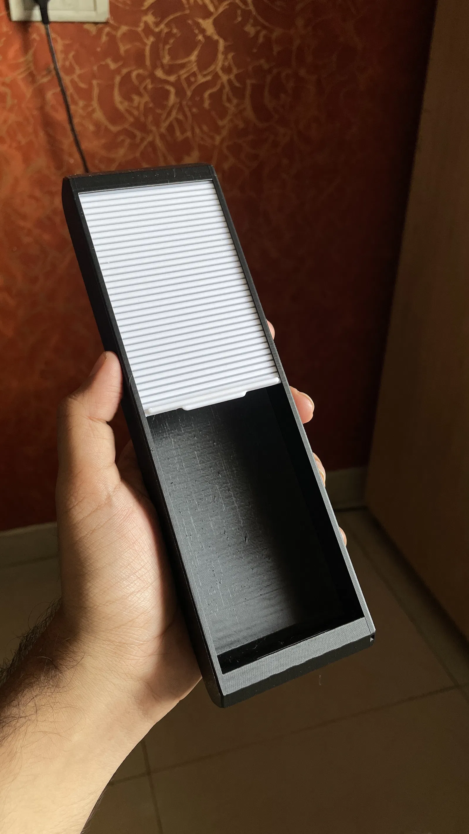 Phiên bản chỉnh sửa từ hộp shutter/slider đơn giản, dùng để cất bút, bút chì, ống dài, ống tiêm hoặc cả đồng hồ. In dễ với 15% infill, không cần supports hay brims.