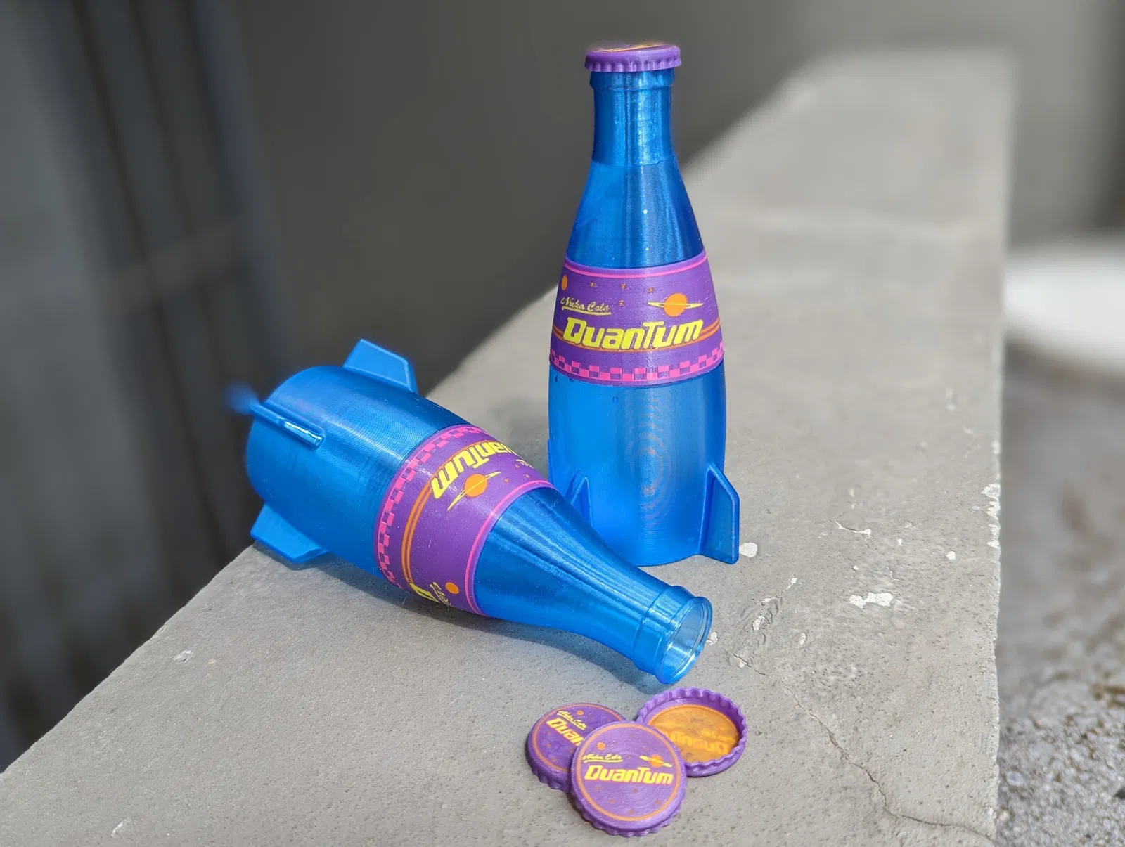 Thôi chơi an toàn đi: tự in cho mình một chai Nuka-Cola Quantum trong Fallout. Tui thiết kế từ đầu dựa theo vài tấm hình của chai gốc. Chai dạng rỗng và đi kèm nắp chai với label. Nắp và label có thể clip-on lên thân chai. Không gắn nắp thì chai cao 178mm và chứa được khoảng 380ml.