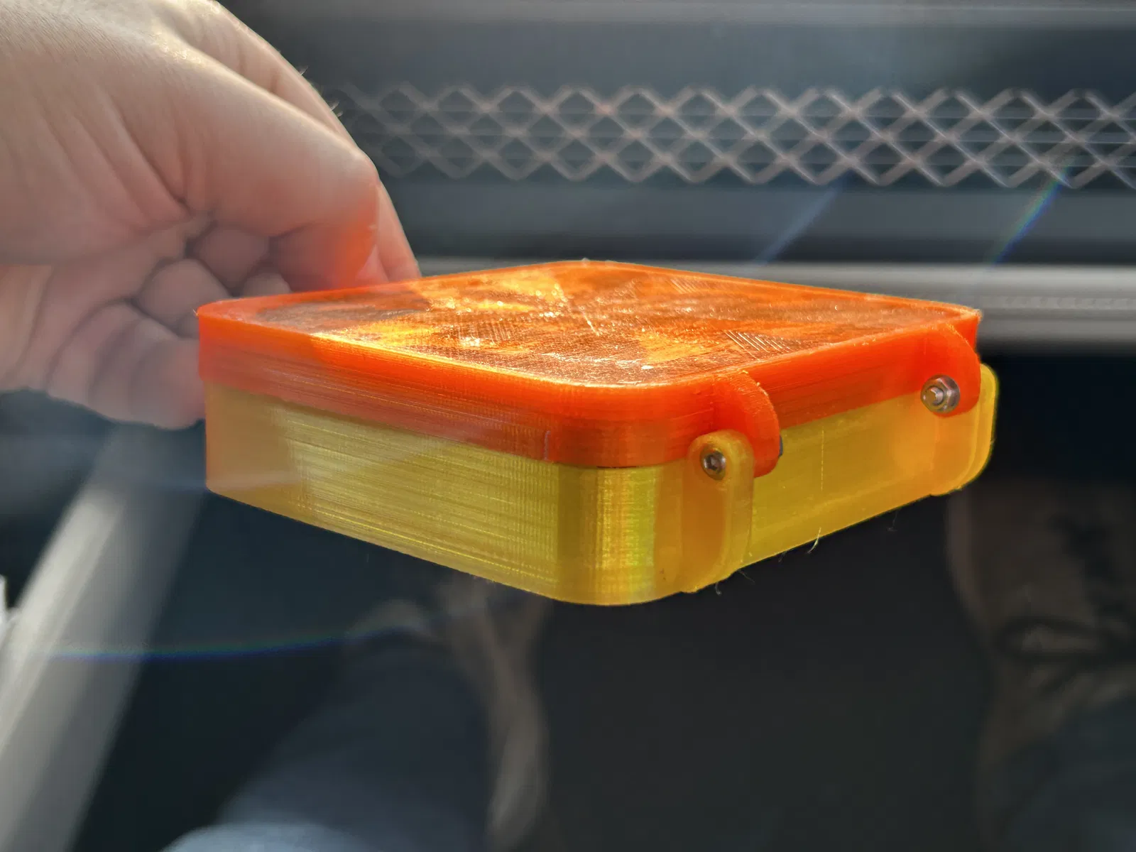 Để lắp, đặt nắp lên phần đáy, rồi luồn vít từ phía ngoài qua bản lề phía sau. Lắp long đền và siết đai ốc cho mỗi vít. Đừng siết quá chặt. Nhỏ một ít keo hoặc dung dịch khóa ren lên đai ốc để tránh tự tuột ra.