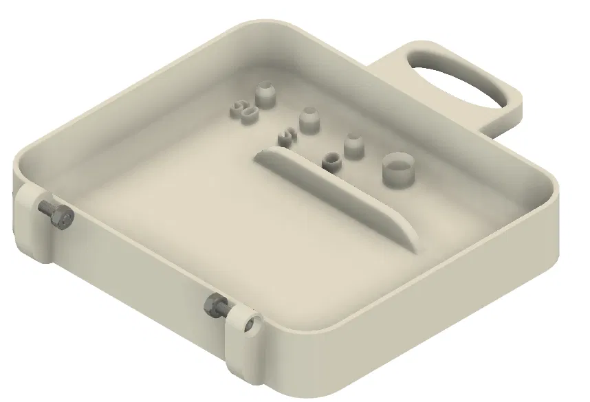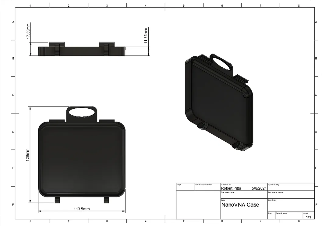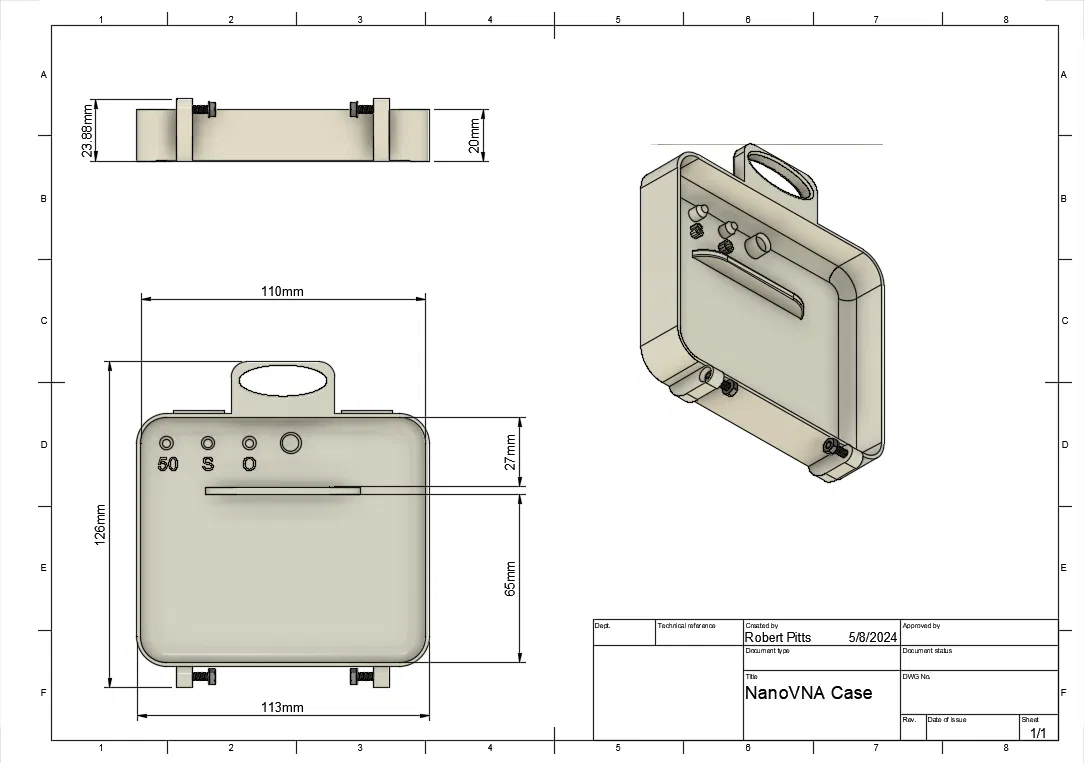 Mẫu vali (briefcase) đựng Nano VNA, có các khe giữ calibration slugs/đầu chuẩn (50 ohm, short, open, passthrough). In 2 mảnh, cần supports. Có thể lót mút xốp tùy nhu cầu để chống xê dịch.