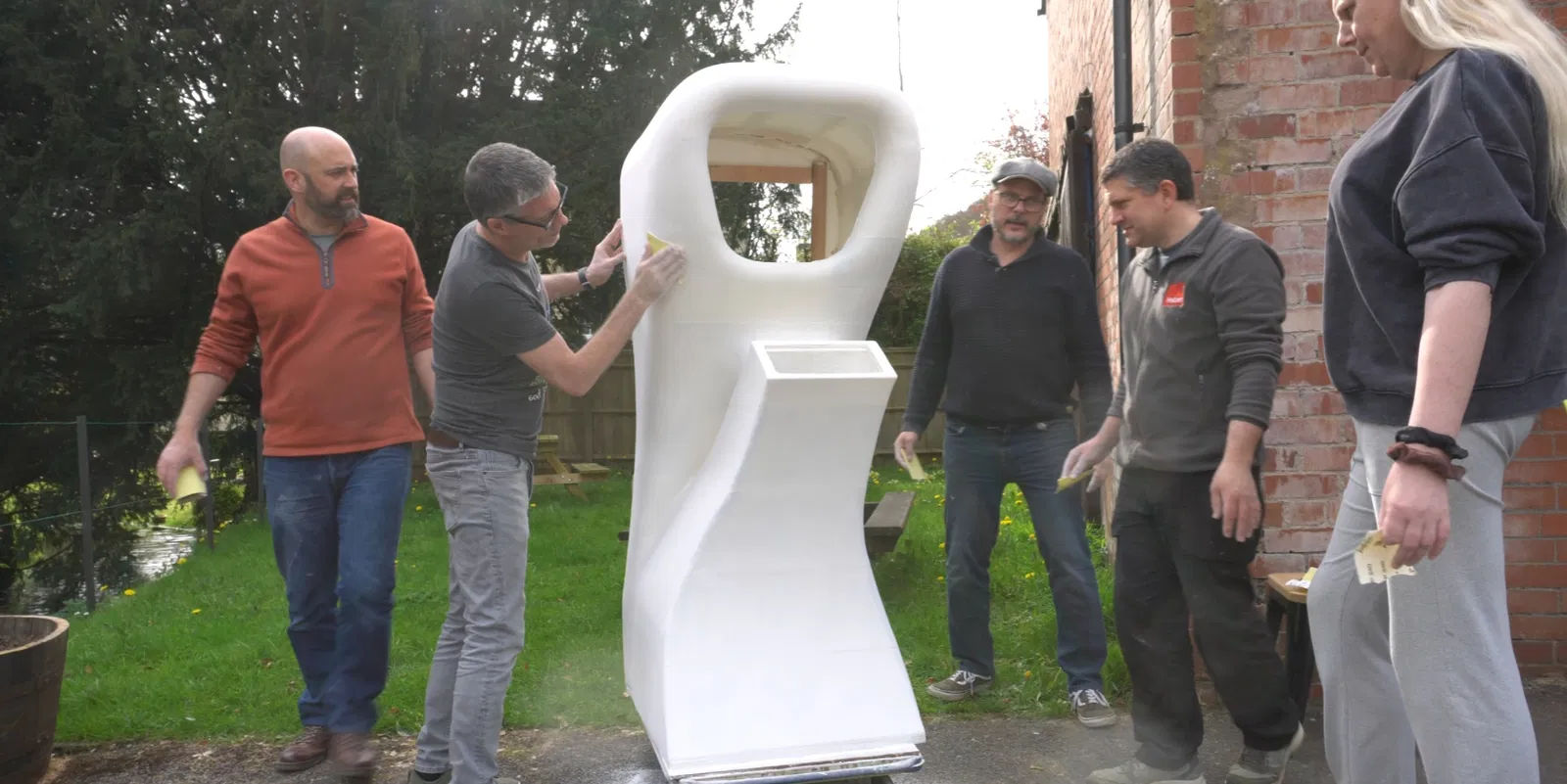 Đến tháng 01/2024 thì trại in 3D (3D print farm) ở Heber được huy động để in gần 100 phần của chiếc máy này. 3DGloop được dùng để dán/ghép các phần lại với nhau, và sau khi cho cả team xem, chiếc máy được trét (fill), chà nhám, sơn, rồi phủ thêm một lớp glitter-resin màu xanh.