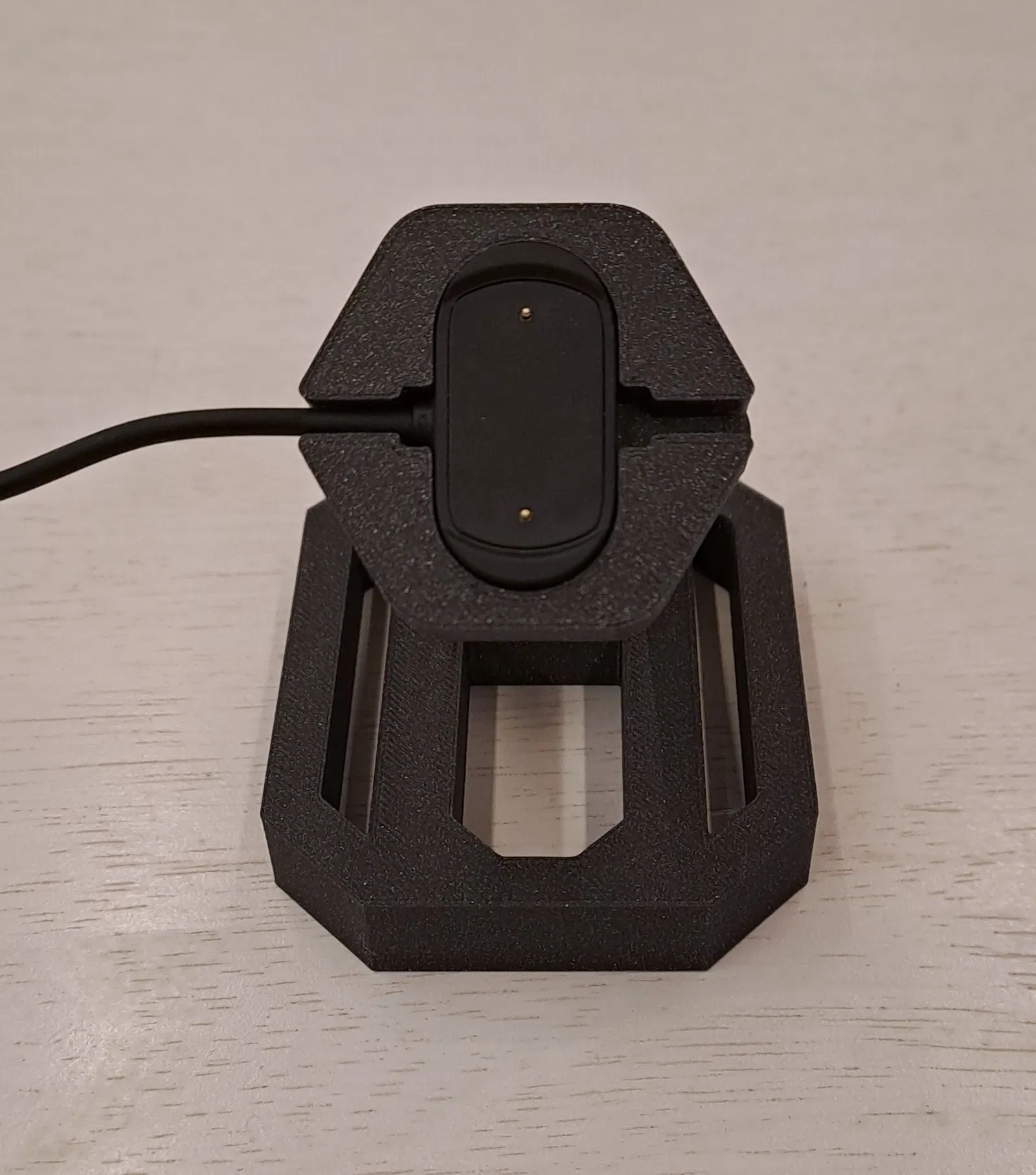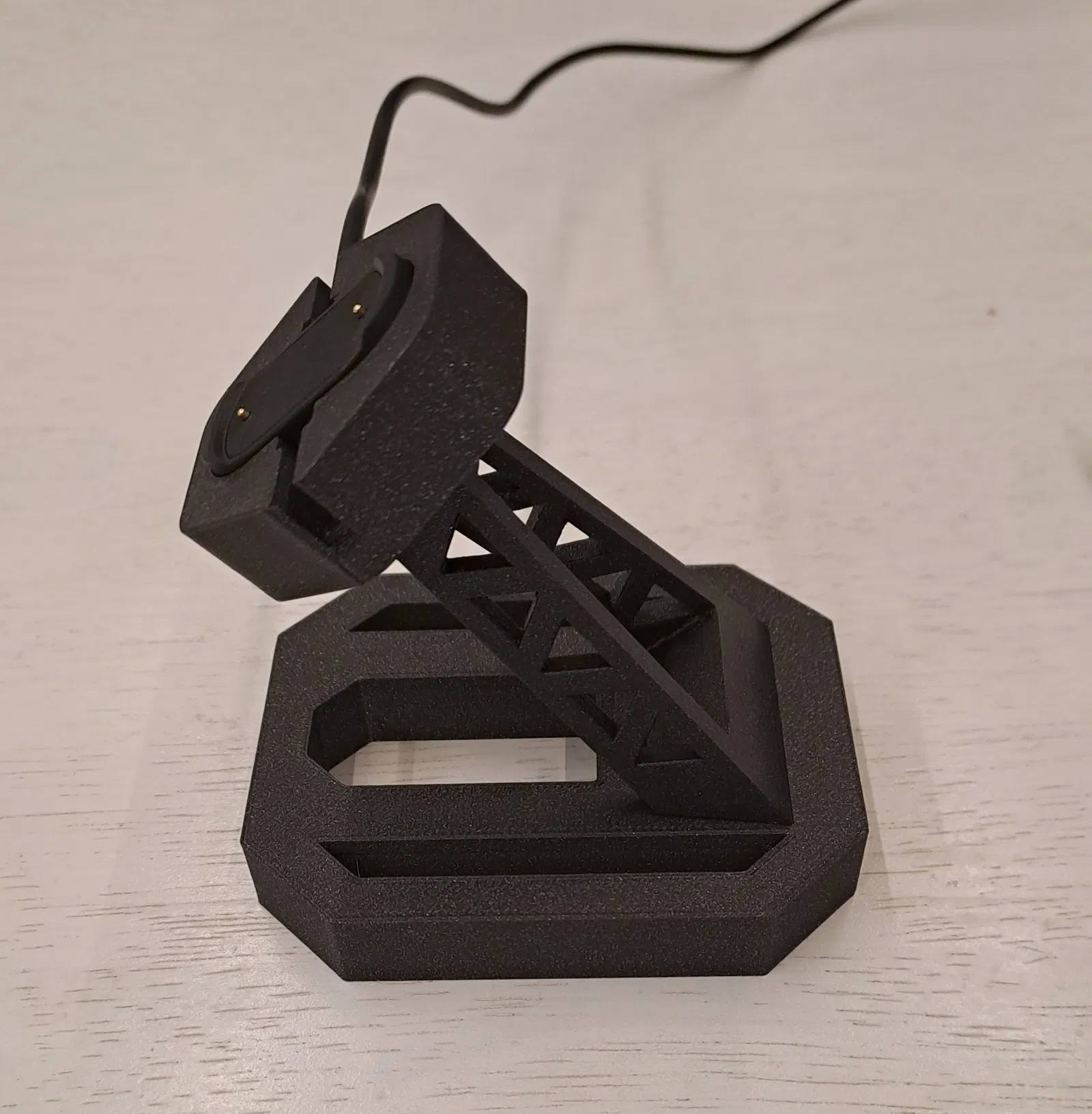 Chân đế này để sạc đồng hồ thông minh được thiết kế chủ yếu cho amazfit T-REX 2. Nó gồm 3 phần chính: base, support và charger holder. Charger holder và tay đỡ được liên kết bằng vít M4x10-12mm đầu chìm (zápustná hlava). Tay đỡ và base được liên kết bằng vít M4x10-12mm đầu trụ lục giác chìm (válcová inbus hlava). Cả hai con vít đều được siết vào đai ốc M4, được đặt vào các hốc đã được tạo sẵn trong model. Một số loại dây đeo có thể rộng hơn 22 mm. Cho các trường hợp này, đã tải lên các kiểu tay đỡ mới. Phần bên trái hoặc bên phải đã được bỏ đi để có thêm không gian cho dây rộng hơn.