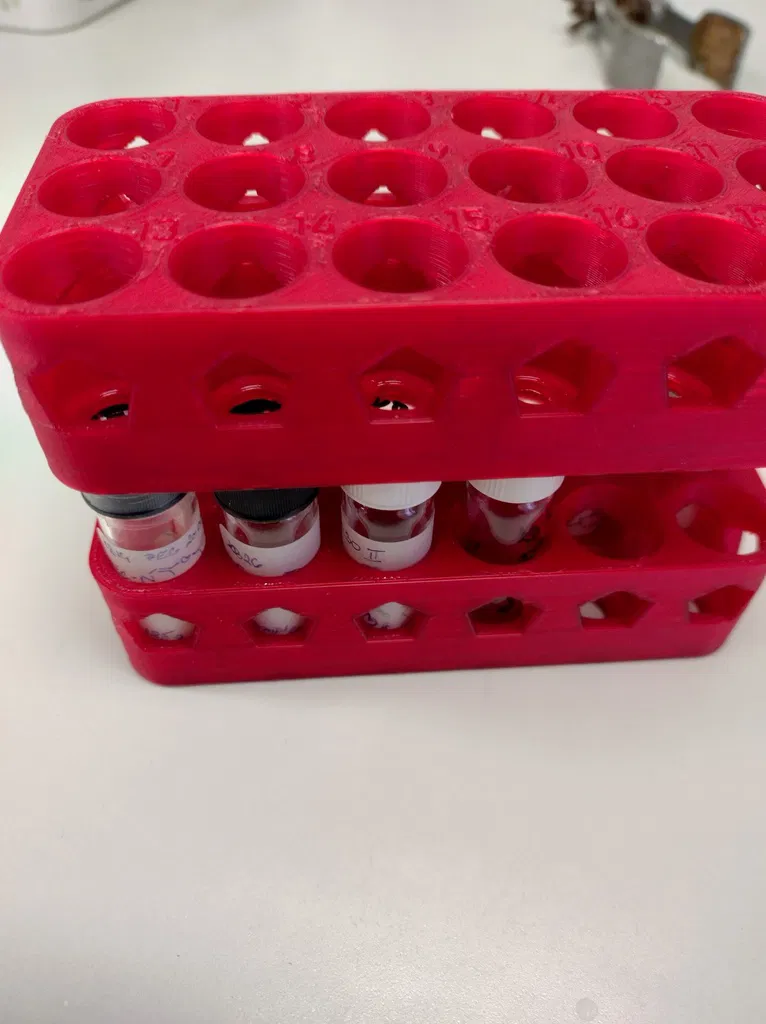 Giá đỡ vial xếp chồng, tùy chỉnh kích thước vial và số lỗ bằng OpenSCAD (file .scad). Mặt dưới có rãnh khớp nắp vial tầng dưới (bật/tắt được). Số thứ tự lỗ in trên mặt trên (bật/tắt).