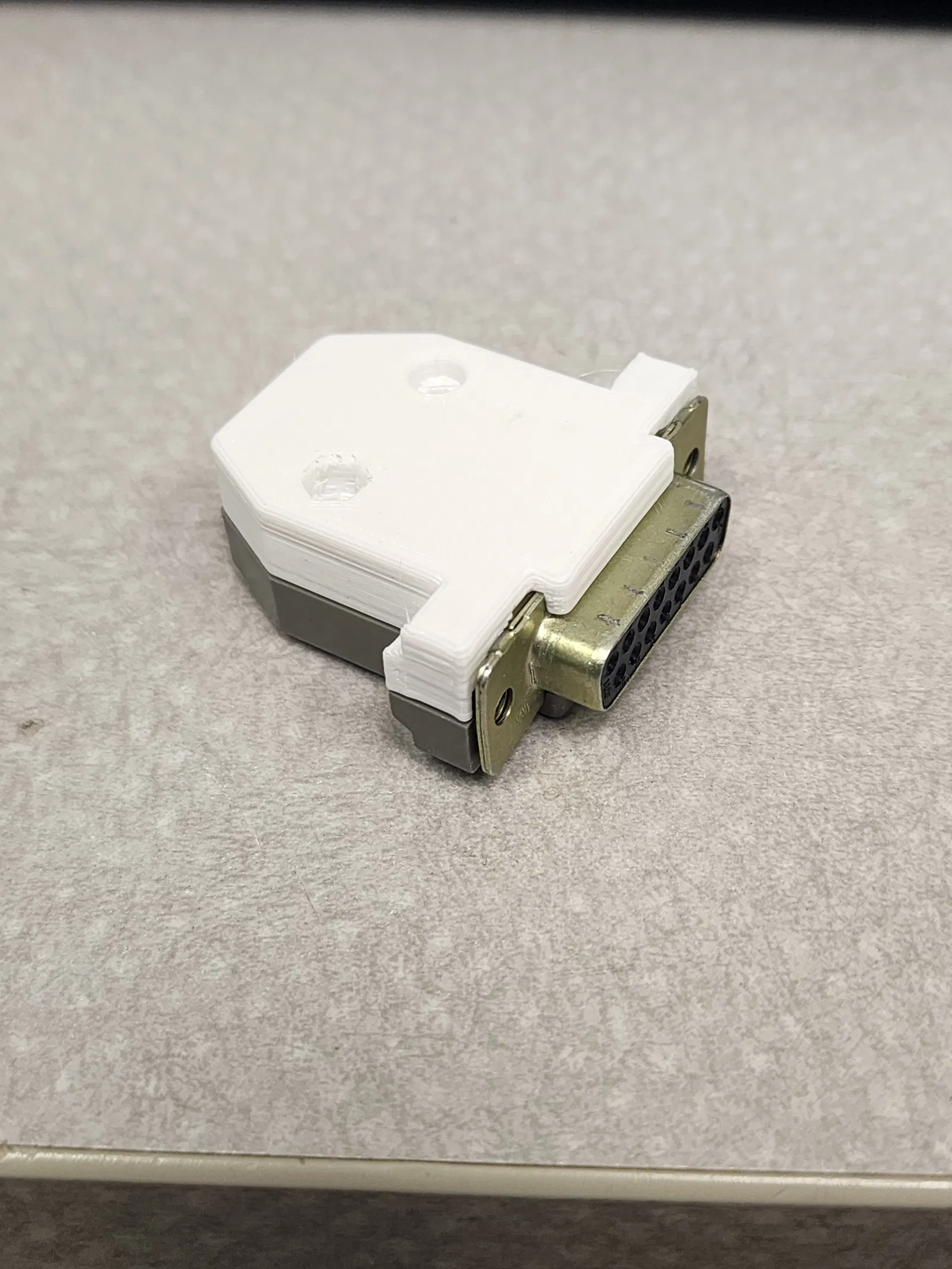Mình đã dựng mẫu này dựa trên một đầu nối DB15 kiểu cổ điển, có chỉnh sửa vài chỗ để in dễ hơn. Dung sai (tolerances) dự kiến sẽ tương thích với một đầu nối tương tự (với máy in 3D đủ chuẩn), như trong hình. Mình cũng đang tính remix để thêm nhiều lựa chọn hỗ trợ/giữ cáp hơn, ví dụ kẹp được cáp to hơn hoặc nhiều sợi hơn.