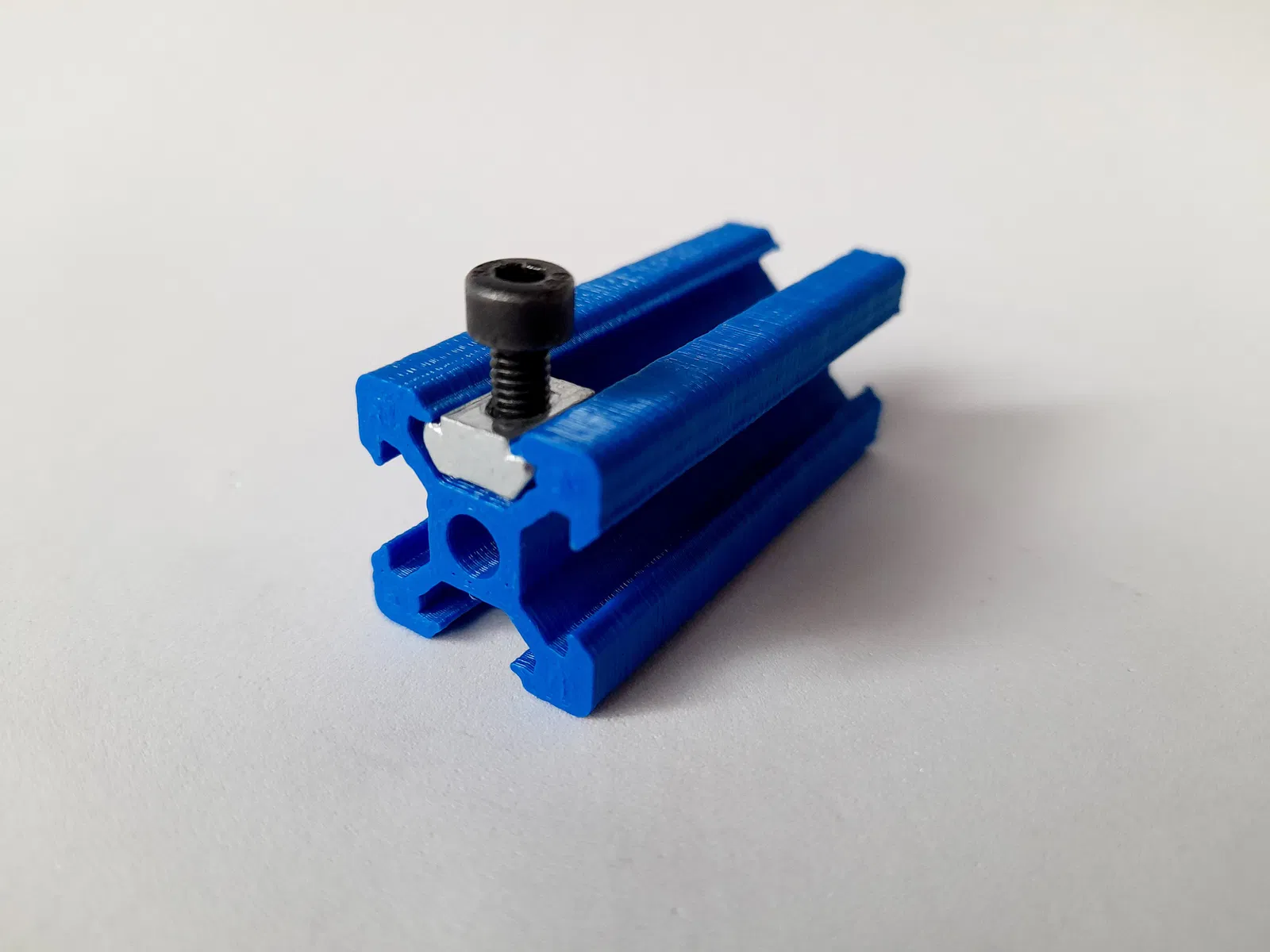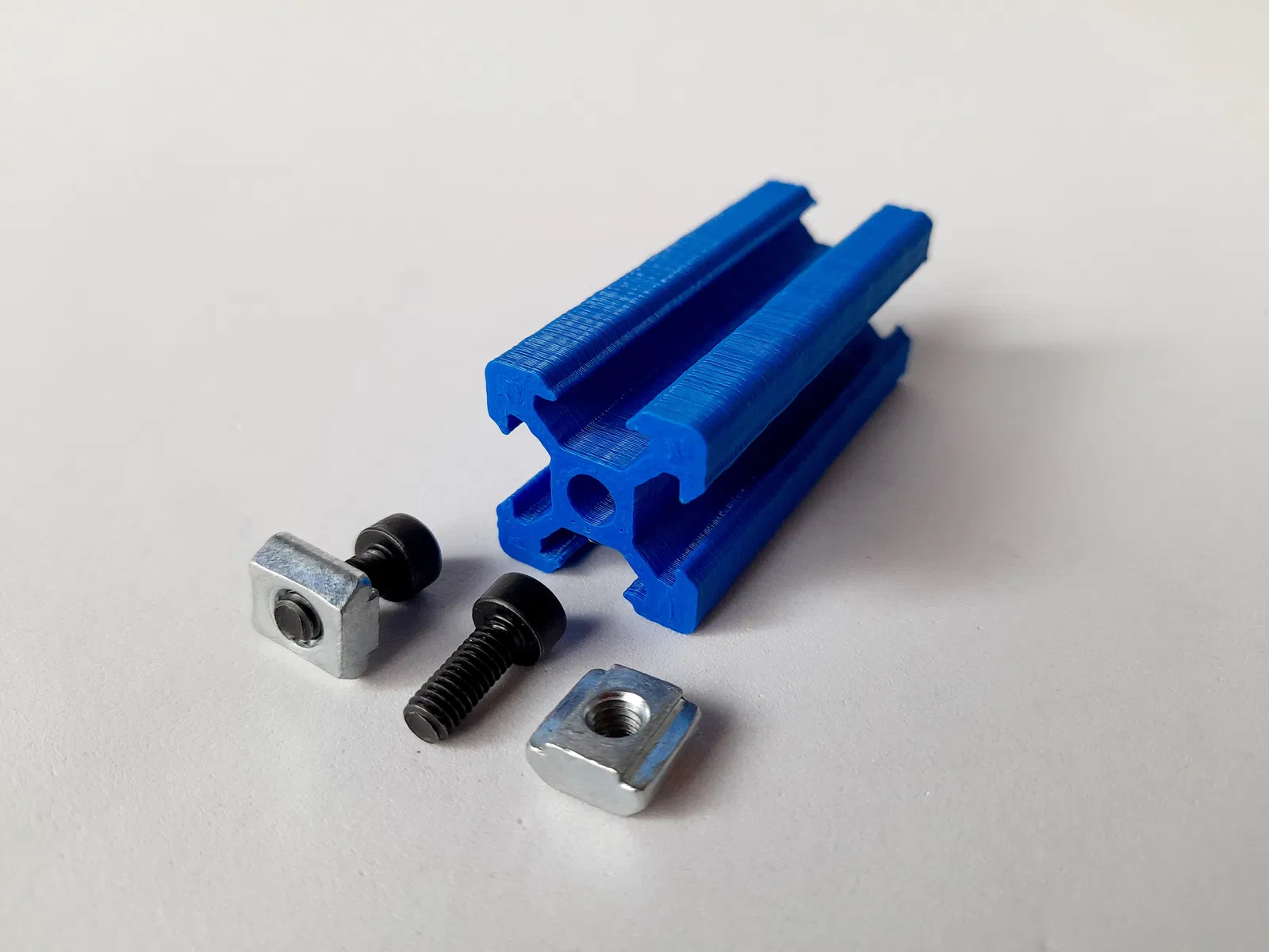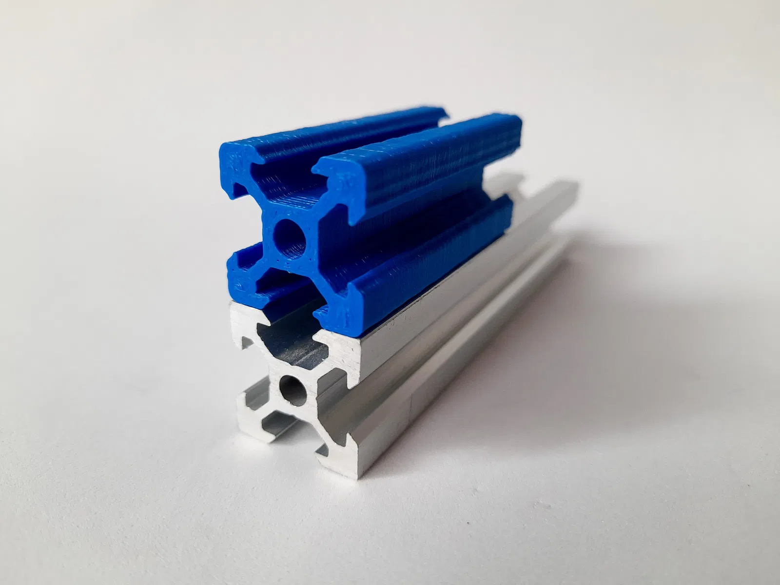 Profile V-slot 2020, có kèm theo chi tiết liên kết (union) giữa các profile góc 90° để phục vụ gia công bằng in 3D.