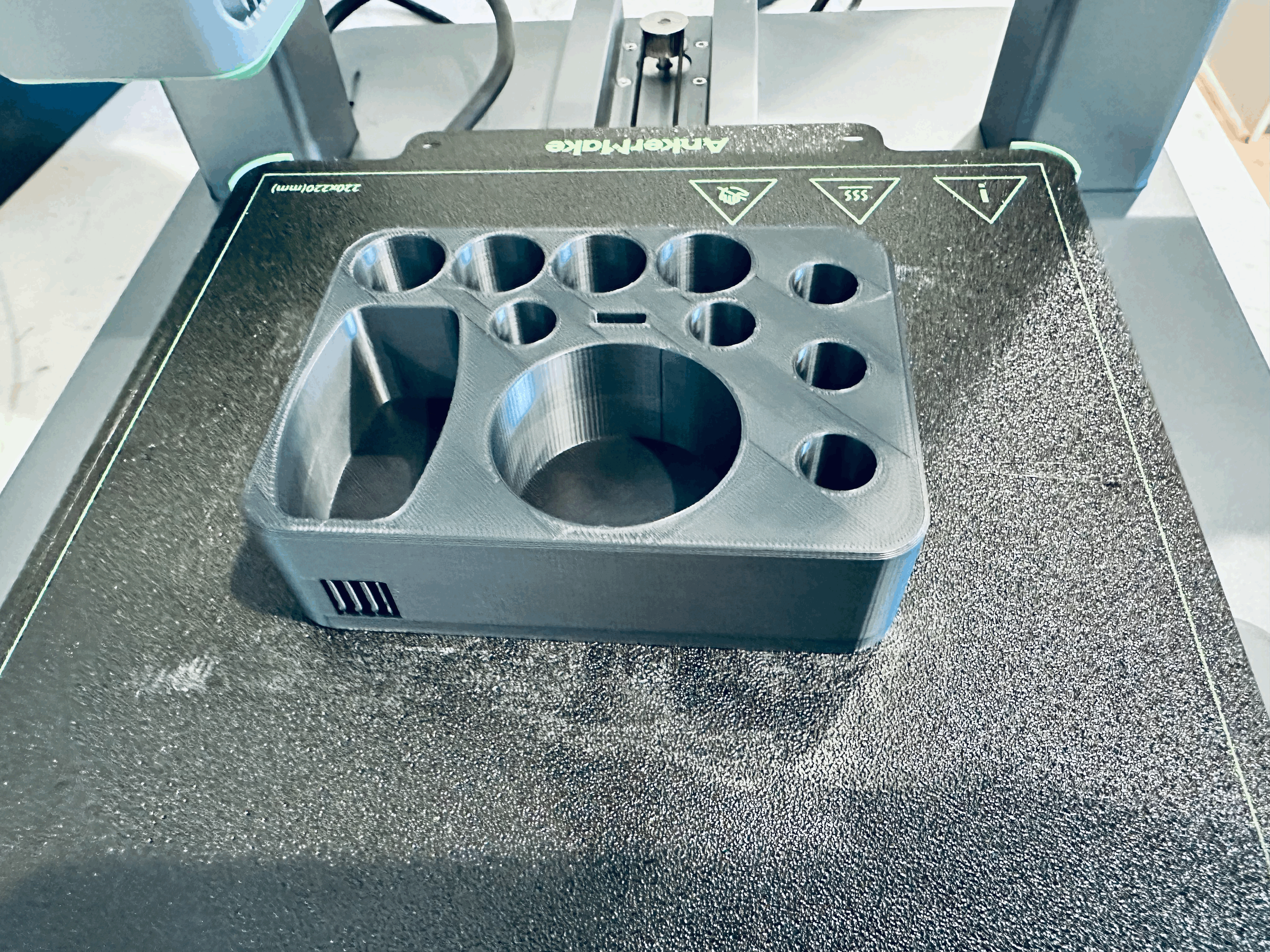 Việc in ấn trạm sạc này cũng khá đơn giản. Theo kinh nghiệm, anh em có thể sử dụng máy in 3D AnkerMake M5C với sợi nhựa PLA+ Silk Grey. Chế độ in nhanh (fast print) cùng với hỗ trợ tự động (Auto Generated Supports) là đủ để cho ra một sản phẩm đẹp và chắc chắn.