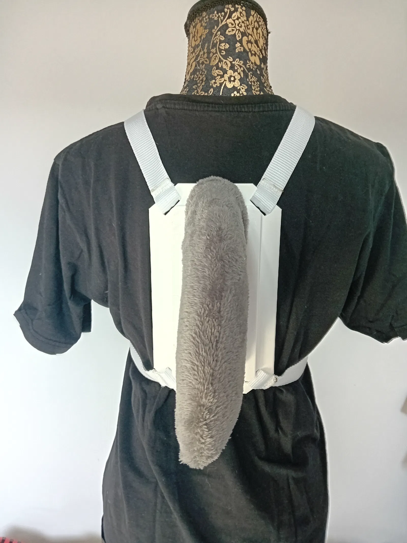 Back plate 2 phần cho manokit/vây cá mập/cánh, giúp đeo ngoài áo mà không làm hư trang phục: phần dây đeo nằm dưới áo như ba lô, phần gắn vây nằm trên áo và trượt vào rãnh. Cần thêm nylon webbing 2cm ~2m.