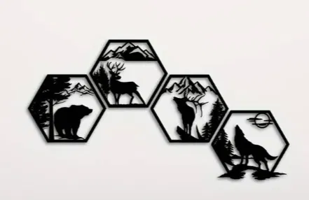 Bạn đang tìm kiếm một điểm nhấn độc đáo cho không gian sống của mình? Bộ 4 khung trang trí hình thú rừng với thiết kế lục giác lạ mắt này sẽ mang cả thiên nhiên hoang dã vào nhà bạn. Mỗi khung là một bức tranh thu nhỏ về thế giới tự nhiên, khắc họa hình ảnh chú gấu hùng vĩ giữa rừng cây, hươu nai kiêu sa dưới chân núi, chó sói đơn độc giữa thảo nguyên và một chú sói khác đang cất tiếng hú gọi trăng.