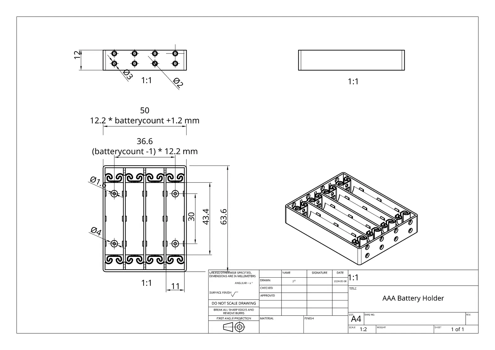 Giá đỡ pin AAA dạng tạm, cho phép bạn tự đi dây theo nhu cầu, không cần terminal hay lò xo. Có cơ chế đàn hồi (compliant mechanism) và lỗ bắt vít để cố định lên thiết kế khác. In không cần supports, dùng wall Arachne.