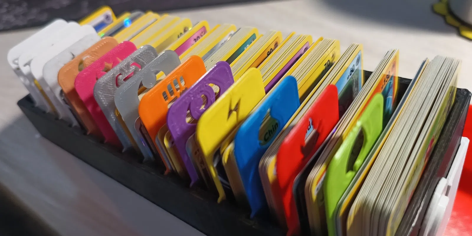 Bộ 2 hộp đựng thẻ Pokemon TCG gồm bản Large và Max, lần lượt chứa 525 và 1.200 lá kèm toàn bộ vách ngăn. Thiết kế dung sai rộng giúp in 3D dễ, hạn chế kẹt/lỗi khi lắp ráp. Kích thước chuẩn ghi rõ.