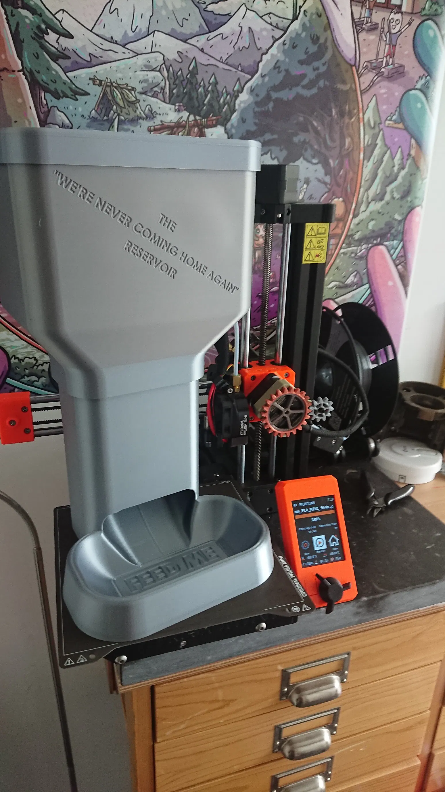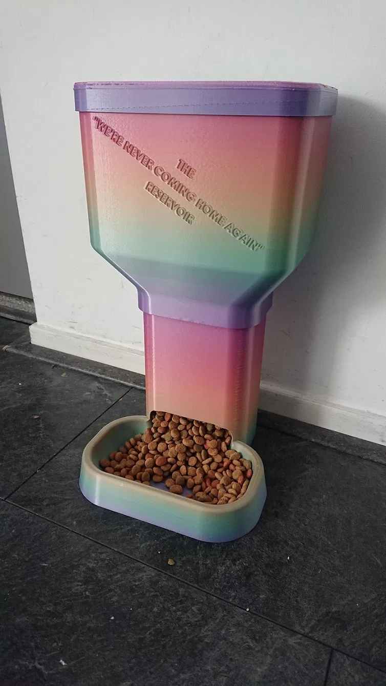 Máng ăn tự động cho mèo dạng thụ động, có bình chứa và phần nối dài. Tô tự đổ đầy mà không cần điện hay can thiệp. Cần một ít supports ở miệng xả bình chứa; in tốt trên Prusa Mini và nhiều máy khác.