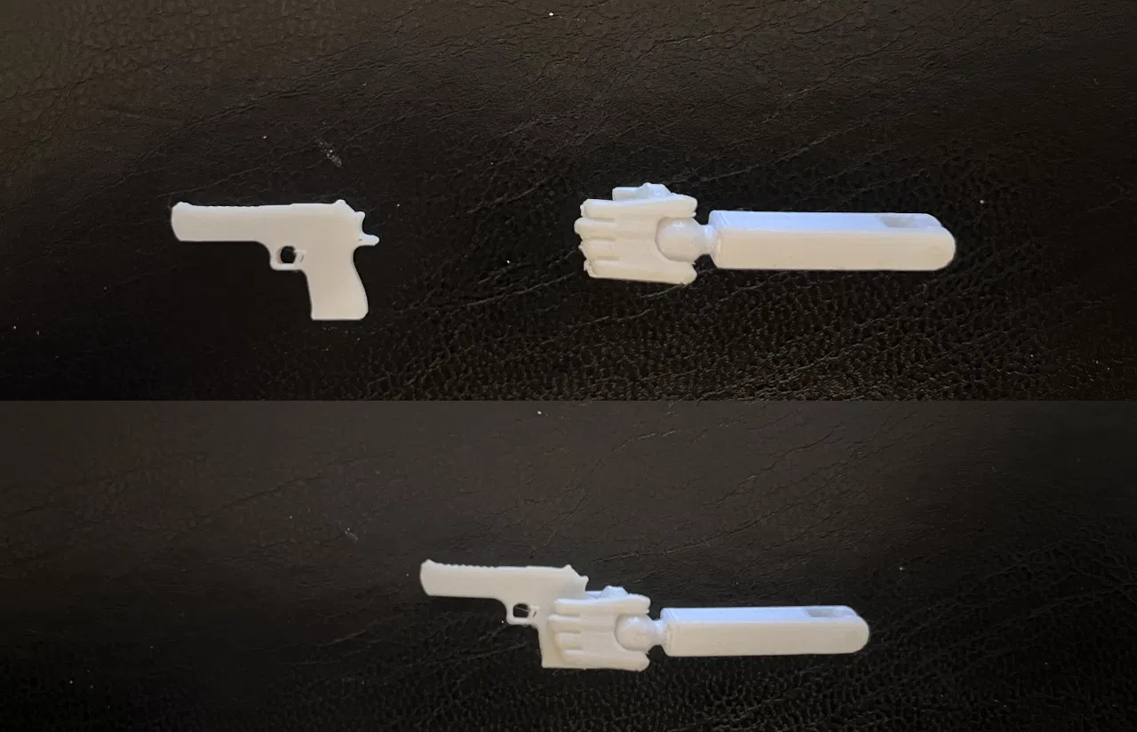 Bàn tay Universal Grip cho DUMMY 13 giúp cầm phụ kiện/súng trông thật hơn mà không cần chốt xấu hay remix. Hỗ trợ hầu hết tay cầm/grip rộng 3mm. Khuyến nghị in PETG, layer 0.10–0.15mm và cần supports.