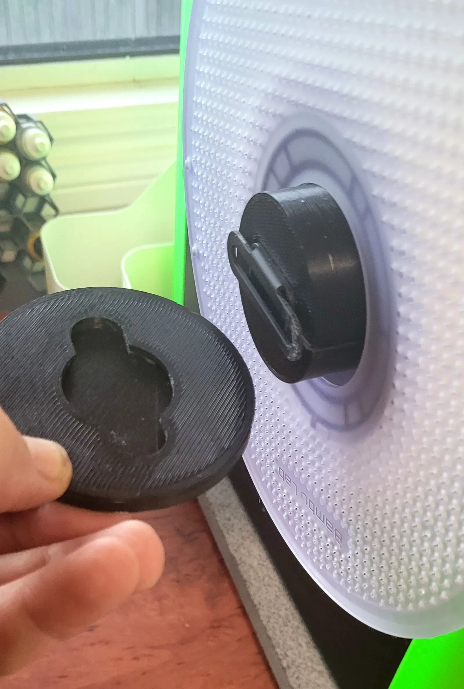 Giá đỡ cuộn filament trơn mượt hơn cho Bambu; cái đi kèm theo máy không được mượt lắm, nên các cuộn còn nửa (gần hết) quay không ngon. Nắp chặn kiểu vặn và “click” để tránh cuộn bị tuột rơi ra. Cụm nắp chặn cần dán keo để ráp lại, và phần thân chính cần 2 con ốc M5 x 30mm. Các lỗ được khoan lệch nhẹ sang một bên để chừa đủ khoảng trống cho nắp chặn.