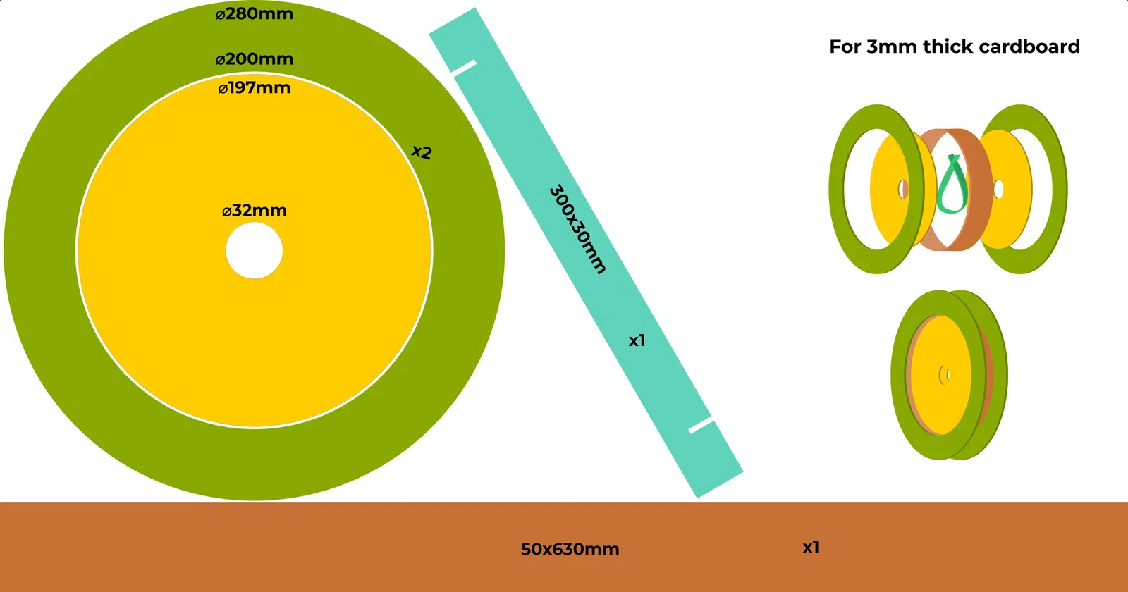 Sản phẩm được làm từ vật liệu bìa carton dày 3mm, đảm bảo độ cứng cáp và bền bỉ. Với kích thước đường kính ngoài lên đến 280mm và đường kính lỗ trục 32mm, nó có thể chứa những cuộn dây tóc PET hoặc PLA có kích thước lớn mà các cuộn nhựa tiêu chuẩn không đáp ứng được. Việc lắp ráp cũng rất đơn giản, chỉ cần cắt các bộ phận từ bìa carton và dán chúng lại với nhau bằng keo trắng. Đây là giải pháp tuyệt vời cho những ai thường xuyên sử dụng lượng lớn dây tóc nhựa cho các dự án in 3D.