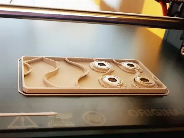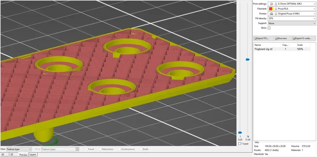 - Một phiên bản của jig có sẵn với các khoang để đặt các vòng đệm giữ (đường kính trong 6mm, đường kính ngoài 12mm, chiều cao tối đa 1.5mm). Những vòng đệm này củng cố các kênh hướng dẫn, duy trì tính toàn vẹn khi vật liệu của jig bị nóng và mài mòn theo thời gian. Để chèn vòng đệm, hãy sử dụng phần mềm cắt của bạn để tạm dừng in tại lớp trước khi khoang của vòng đệm bị bao kín (xem ảnh chụp màn hình để biết ví dụ). Nếu bạn không muốn sử dụng vòng đệm, chỉ cần sử dụng STL 'không có vòng đệm'.