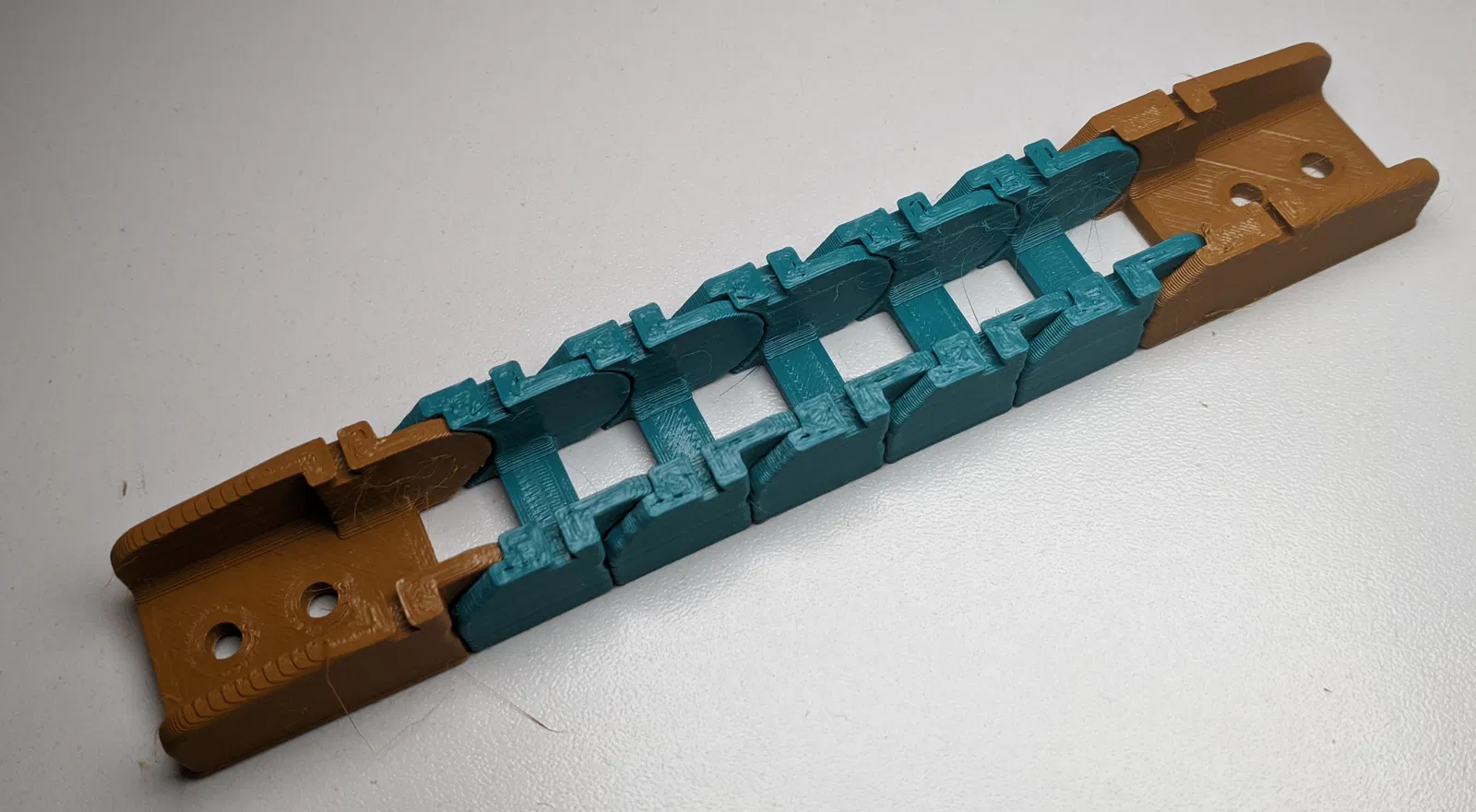 Drag chain dạng mở “over-engineered”, tối ưu phần hinge để không bị overhang, in xong chạy mượt không cần clean up. Khóa chain bằng đoạn filament 1,75mm, không cần supports; có các size 19,5mm và 22,5mm.