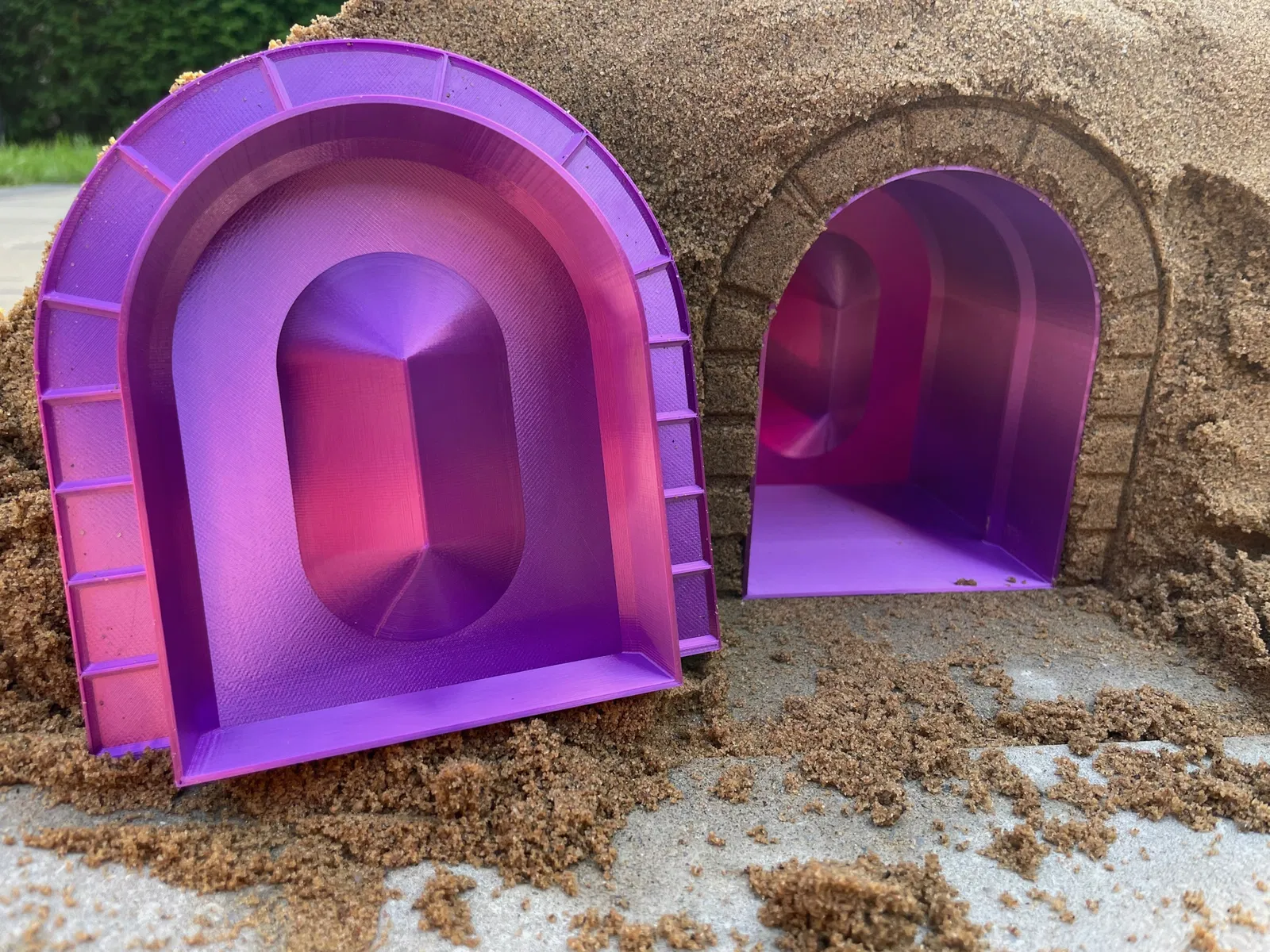 Khuôn tạo cổng lâu đài, vòm và đường hầm bằng cát. Có bản có flange mô phỏng họa tiết vòm đá (kèm khuôn lồng để ra họa tiết hai mặt) và bản không flange. In úp tay cầm, không cần supports.