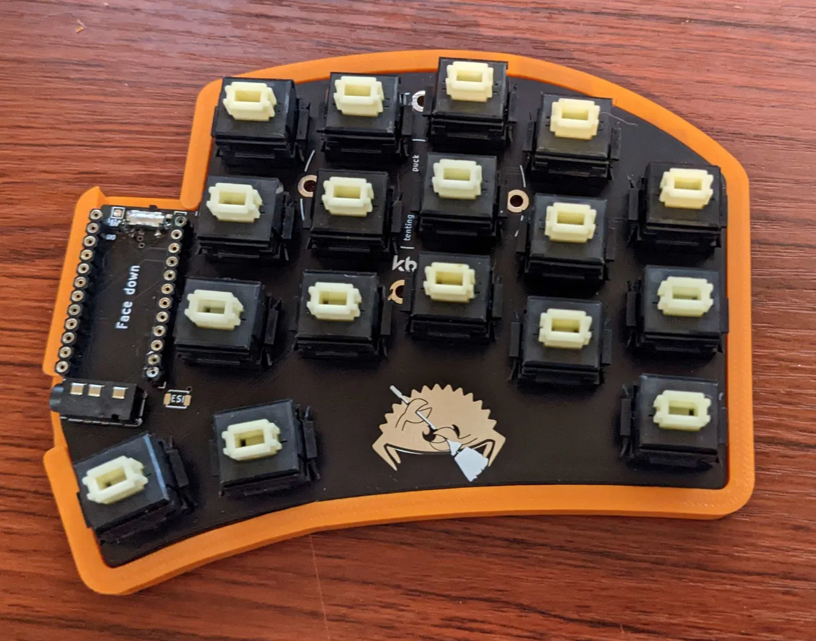 Mẹo: Chỉ cần dùng 3 con vít để cố định PCB vào case là đủ, vì có 1 lỗ vít của tenting puck khá khó đưa tua vít vào do choc switch bị vướng. (Ghi chú của người remix: mình không rõ giờ còn bị vậy không, nhưng mình lắp Alps switch to hơn vẫn với tới các lỗ vít bình thường.)