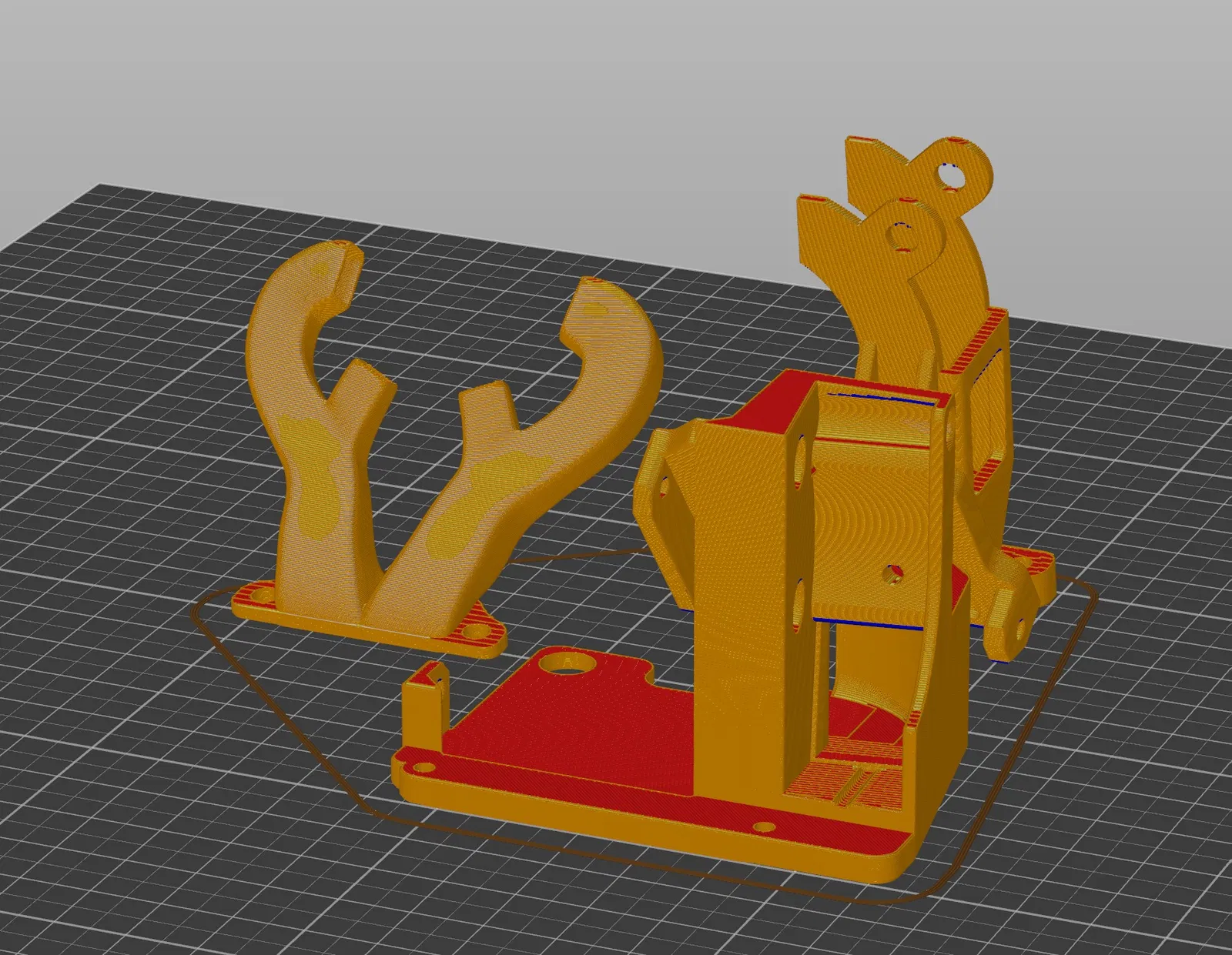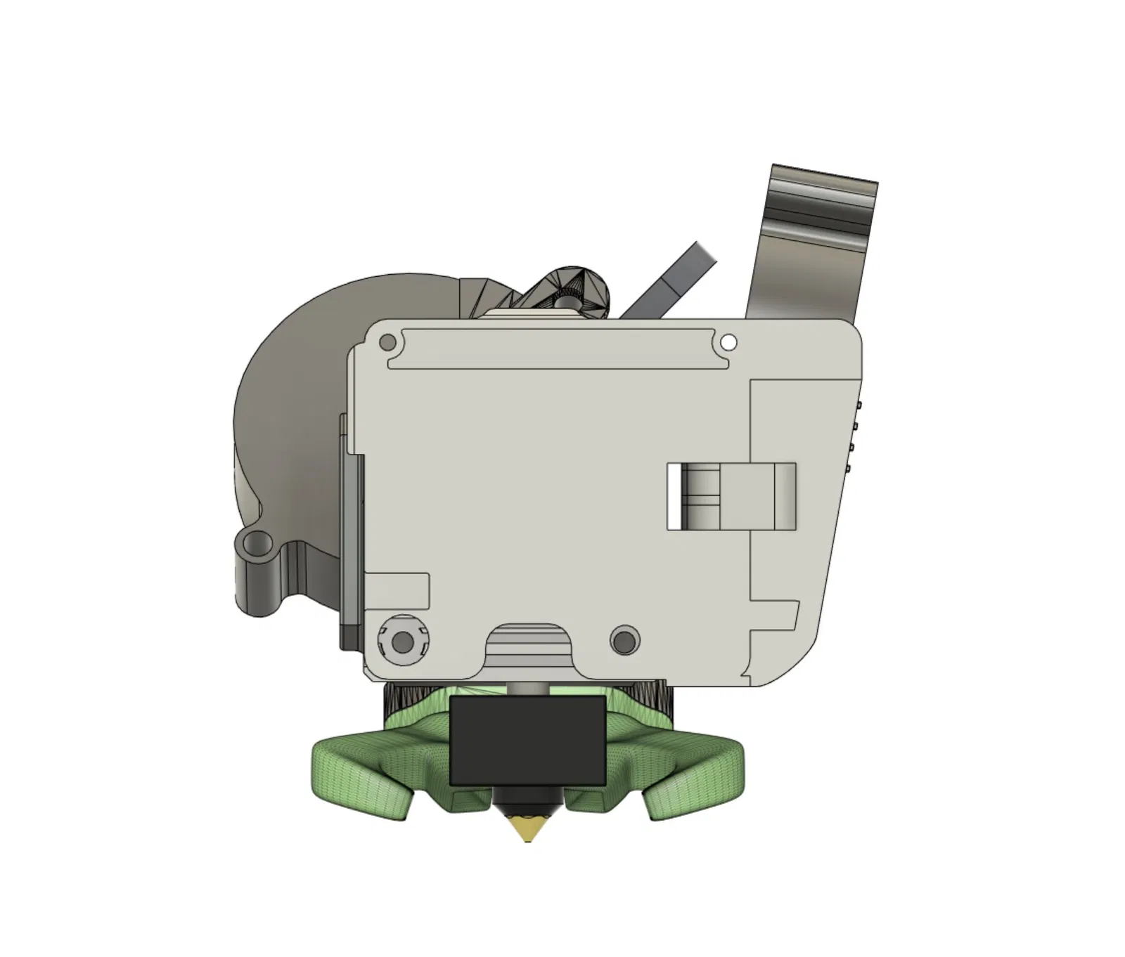 Phần mình thêm vào so với model gốc là mình bỏ hẳn mounting plate nguyên bản và thiết kế lại hoàn toàn. Model gốc không canh đúng với nozzle (ít nhất là tại thời điểm đó). Mình cũng thêm điểm bắt ốc thứ 3 để giảm rung, rồi làm mỏng toàn bộ cụm lại. Mình cũng làm các lỗ nhỏ hơn chút để có thể vặn vít M3 trực tiếp mà không cần ê-cu. Mình không thay đổi gì ở ống gió hình “con tuần lộc”, nên nên xem qua trang của tác giả gốc phòng khi bạn ấy có cải tiến nào bạn thích hơn.