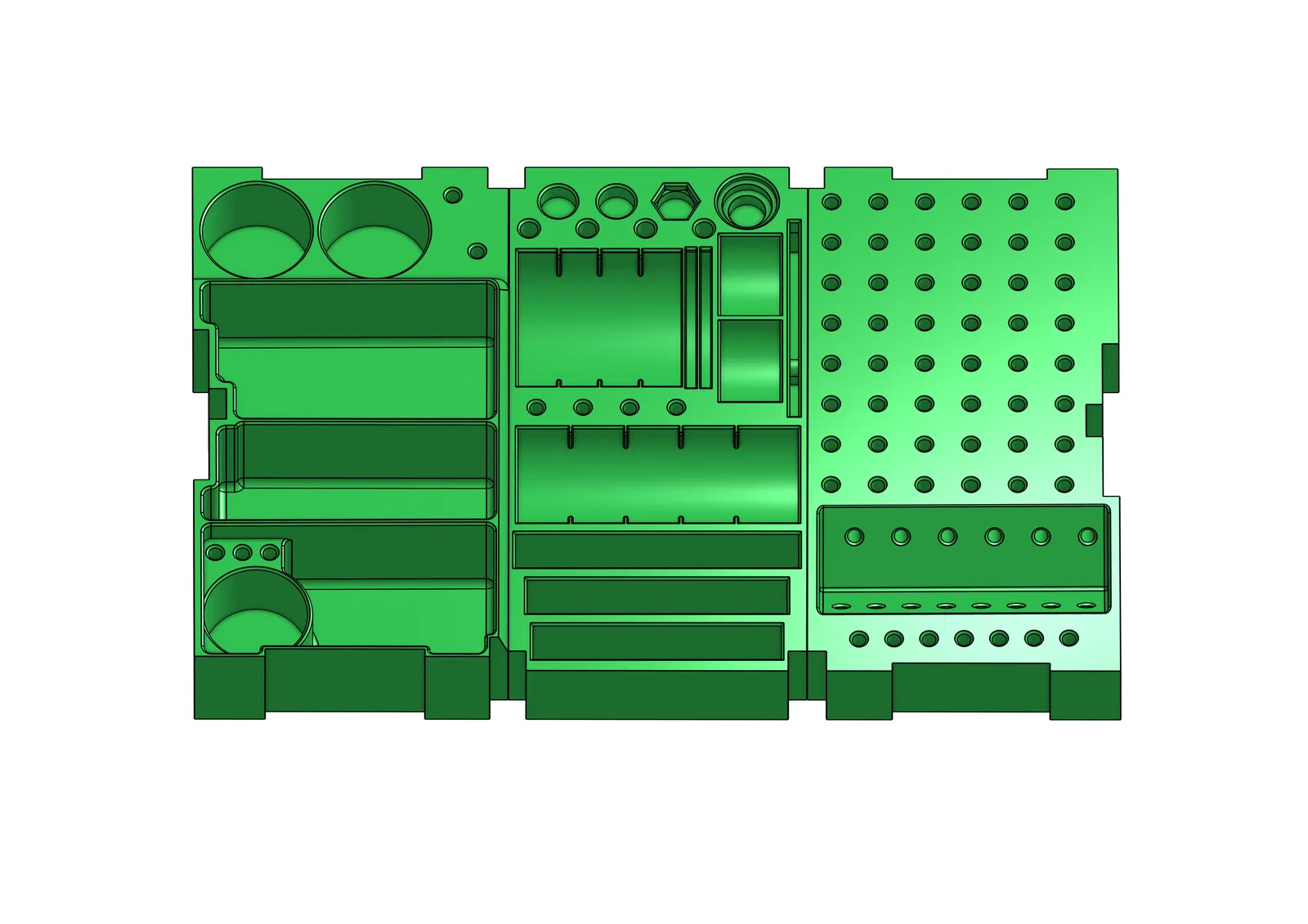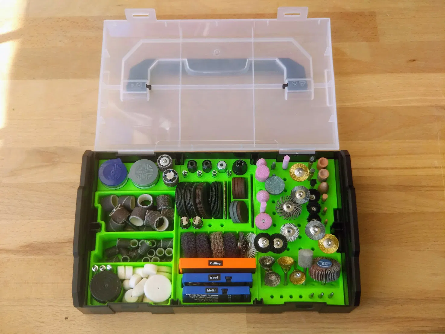 Bố cục được chia thành ba phần riêng, in tách rời từng phần. Bên dưới là tổng quan về khay organizer, mô tả vị trí cho các loại mũi Dremel khác nhau. Hộp đựng cho các mũi cắt có thể xem tại đây.