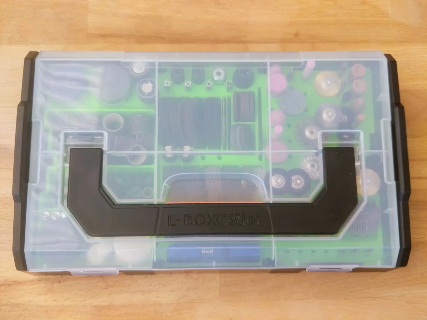 Khay insert dành cho L-Boxx Mini giúp sắp xếp gọn gàng các mũi Dremel. Thiết kế chia 3 phần in riêng, STL đã xoay sẵn, có kèm file STEP để remix dễ dàng.