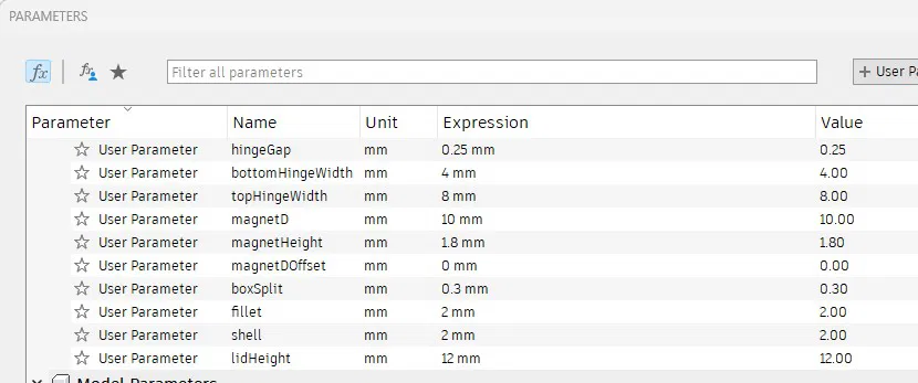 Mình rất thích thiết kế Fusion 360 của tác giả gốc và có chỉnh sửa thêm vài điểm. Thiết kế bản lề rất thông minh và hoàn toàn parametric, nhưng trong một số trường hợp thì thiết kế có thể bị hư. Mình đã làm các thay đổi sau: