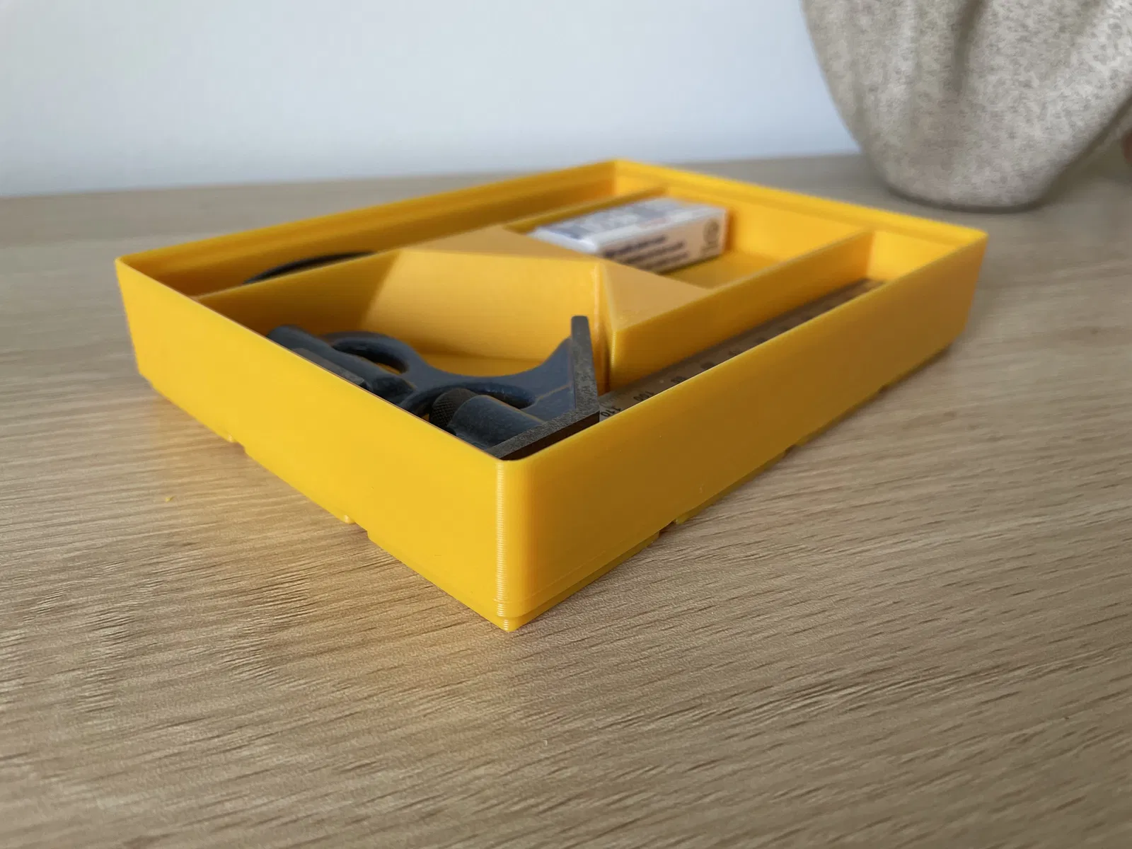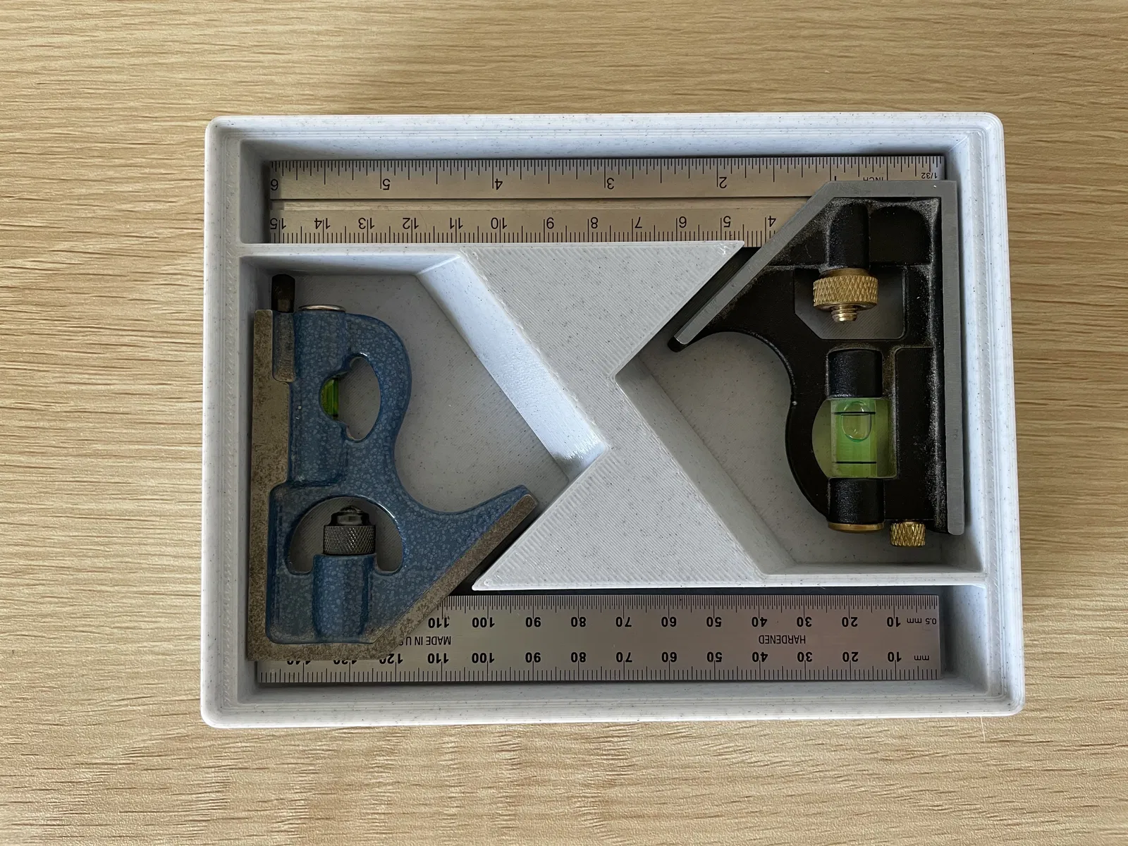 Mình đã test tất cả với 2 cây combo square (một cây PEC từ Taylor Tools và một cây Swanson từ Lowes) và mình chừa khoảng hở/padding khá thoải mái quanh thước. Nhưng nếu thước của bạn không vừa, báo mình biết nha để mình cập nhật model!