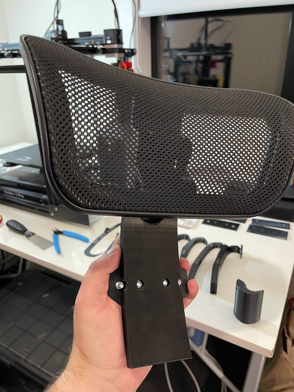 Hệ thống được thiết kế để sử dụng các vít kẹp đi kèm để gắn tựa đầu vào bộ chuyển đổi, sau đó dùng vít M5 để gắn tấm đế vào giá đỡ tương thích với Fern. Vít M5 x 10 là phù hợp để gắn tấm đế vào, sau đó vít M5 x 20 (dài hơn cũng có thể dùng được) để kẹp phần giá đỡ từ bên dưới. Có không gian trong mô hình để sử dụng các ốc ren cho tấm đế, tôi thấy rằng việc vặn trực tiếp vào bản in không mang lại sự chắc chắn mà tôi mong muốn khi có tải trọng lên tựa đầu.