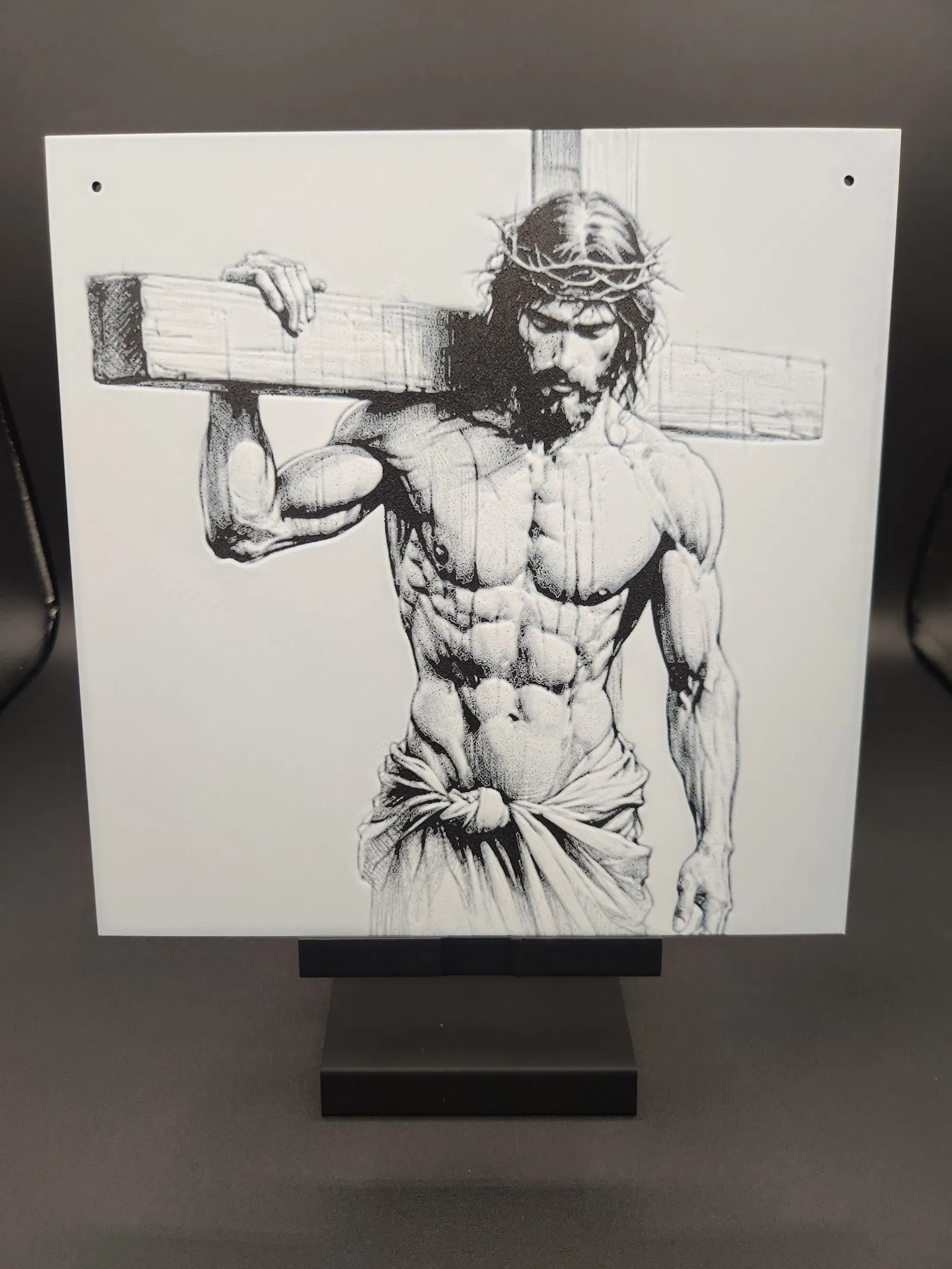 Mẫu Hueforge tri ân sự hy sinh của Chúa Giêsu. In với nozzle 0.4mm, layer height 0.05mm, infill rectilinear và top surface Hilbert. Hướng dẫn đổi màu: PolyLite PLA Black sang PolyLite White tại 2.15mm.