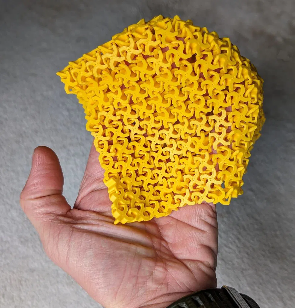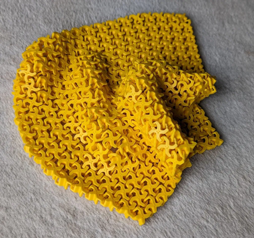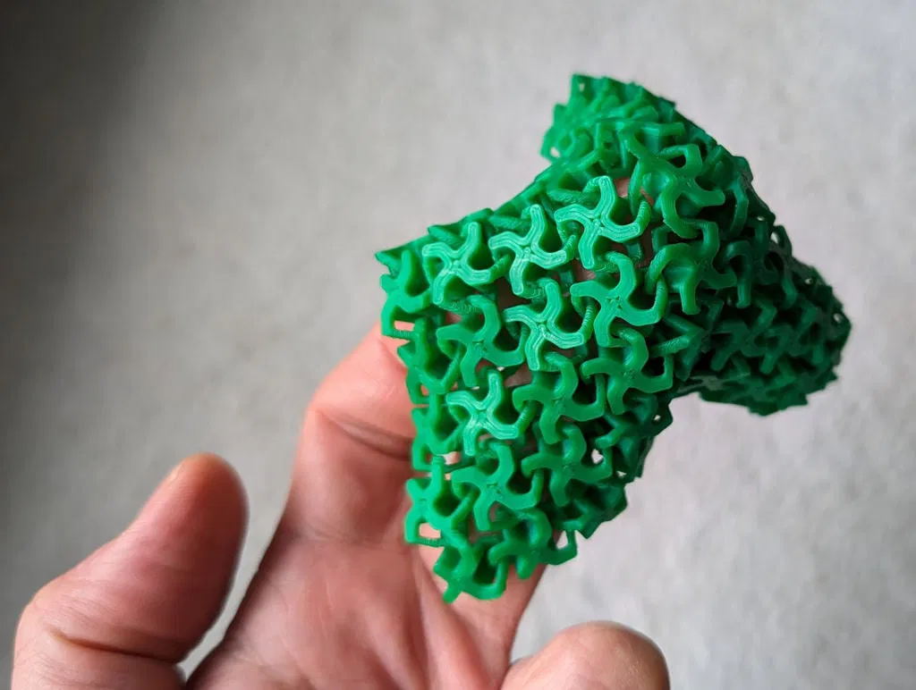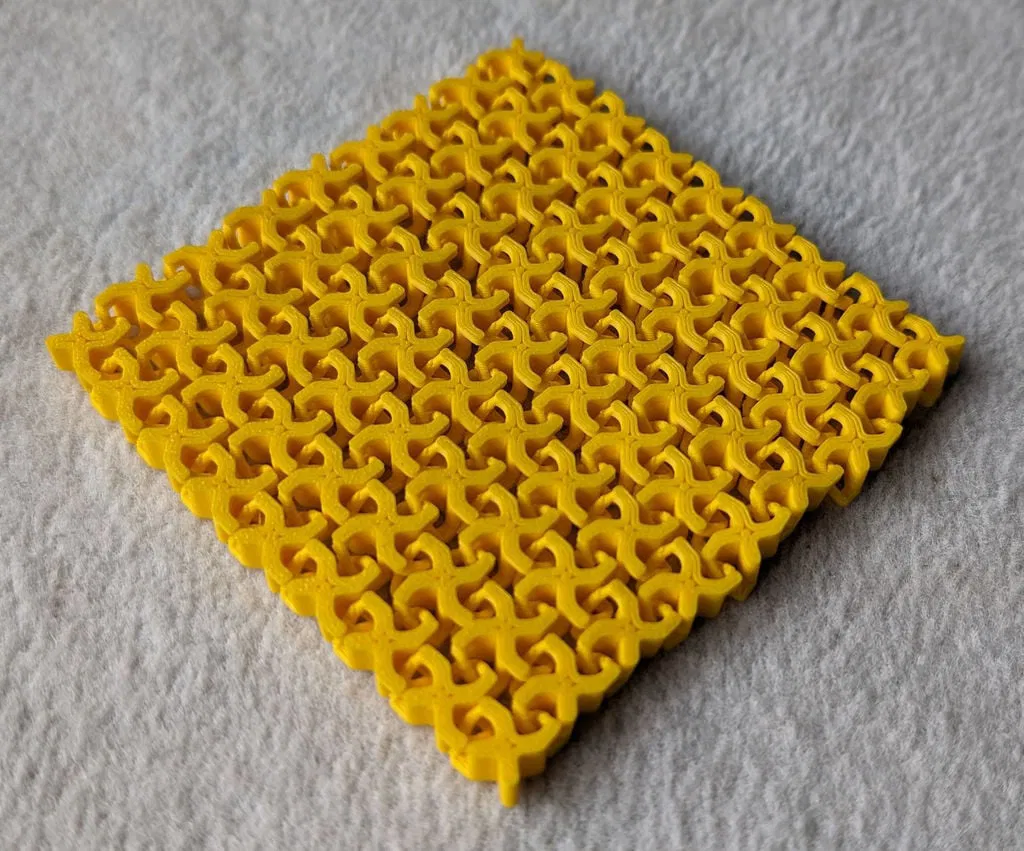 Mình đã làm thử vài thiết kế trước đó rồi mới chốt lại mẫu này. Trên máy của mình, lần nào in cũng ổn, không gặp vấn đề gì. Phần “vải” không bị rối hay bung. Khi đặt lên mặt phẳng, nó tự nằm ngay ngắn rất đẹp. Các mắt vải khóa (interlock) với nhau ở hai bên nhưng vẫn chừa độ rơ để có thể cử động nhẹ, nhờ vậy tổng thể vẫn mềm dẻo.