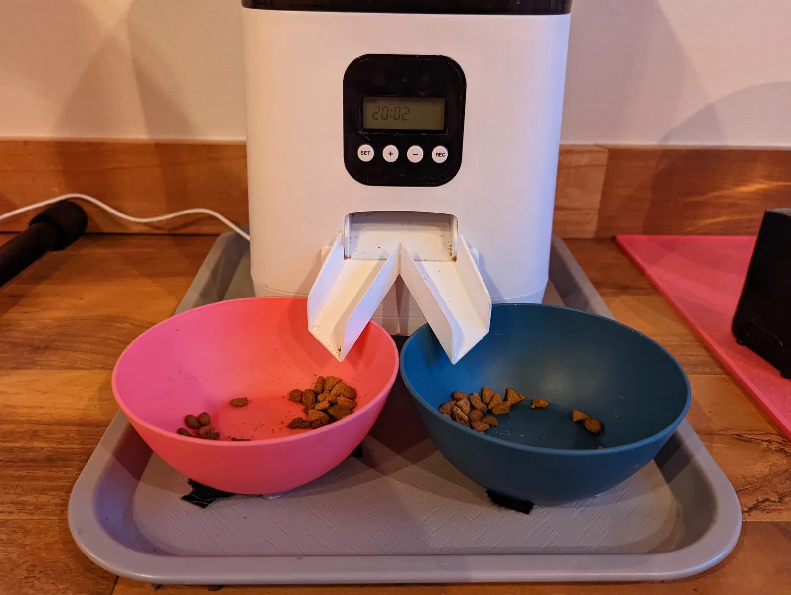 Sau đó, gắn bộ chia vào "kết nối phụ kiện" (nơi bát đi kèm với bộ cấp liệu thường được gắn) và đặt hai bát ở phía trước nó.