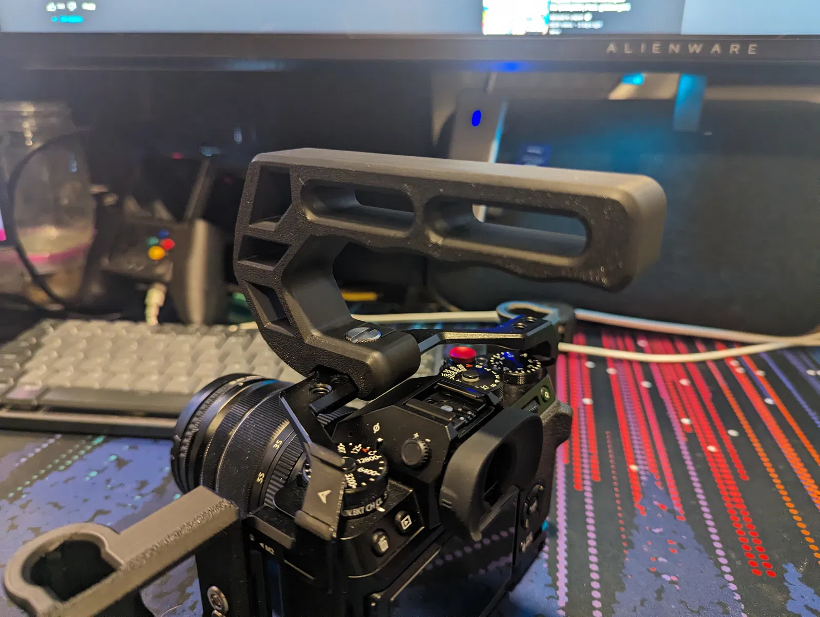 Mẫu có thể in hoàn toàn mà không cần support. Vít được lắp lỏng vào camera cage trước, rồi trượt tay cầm vào, sau đó lắp nút chặn (plug) cuối cùng, rồi siết chặt vít lại.