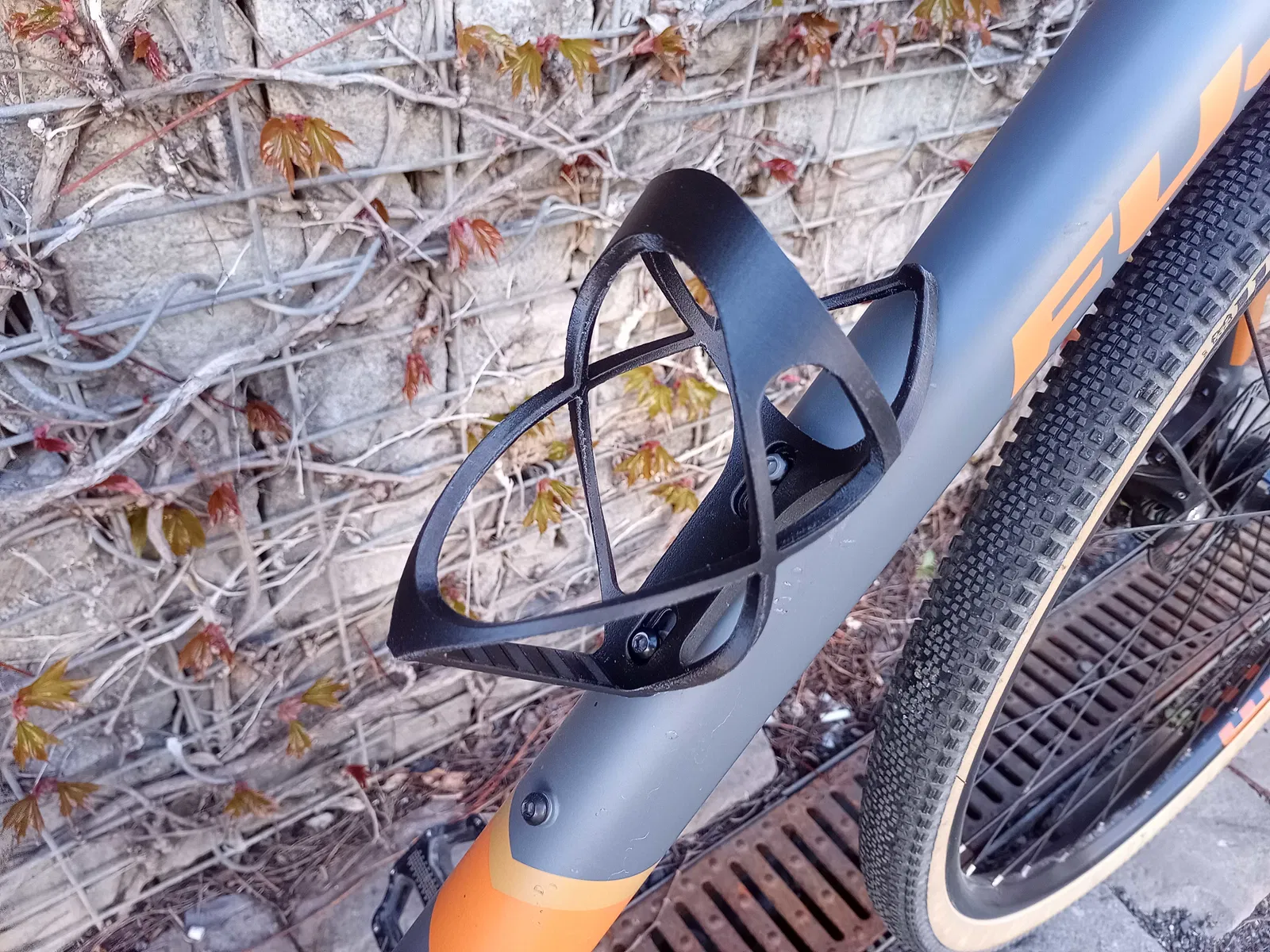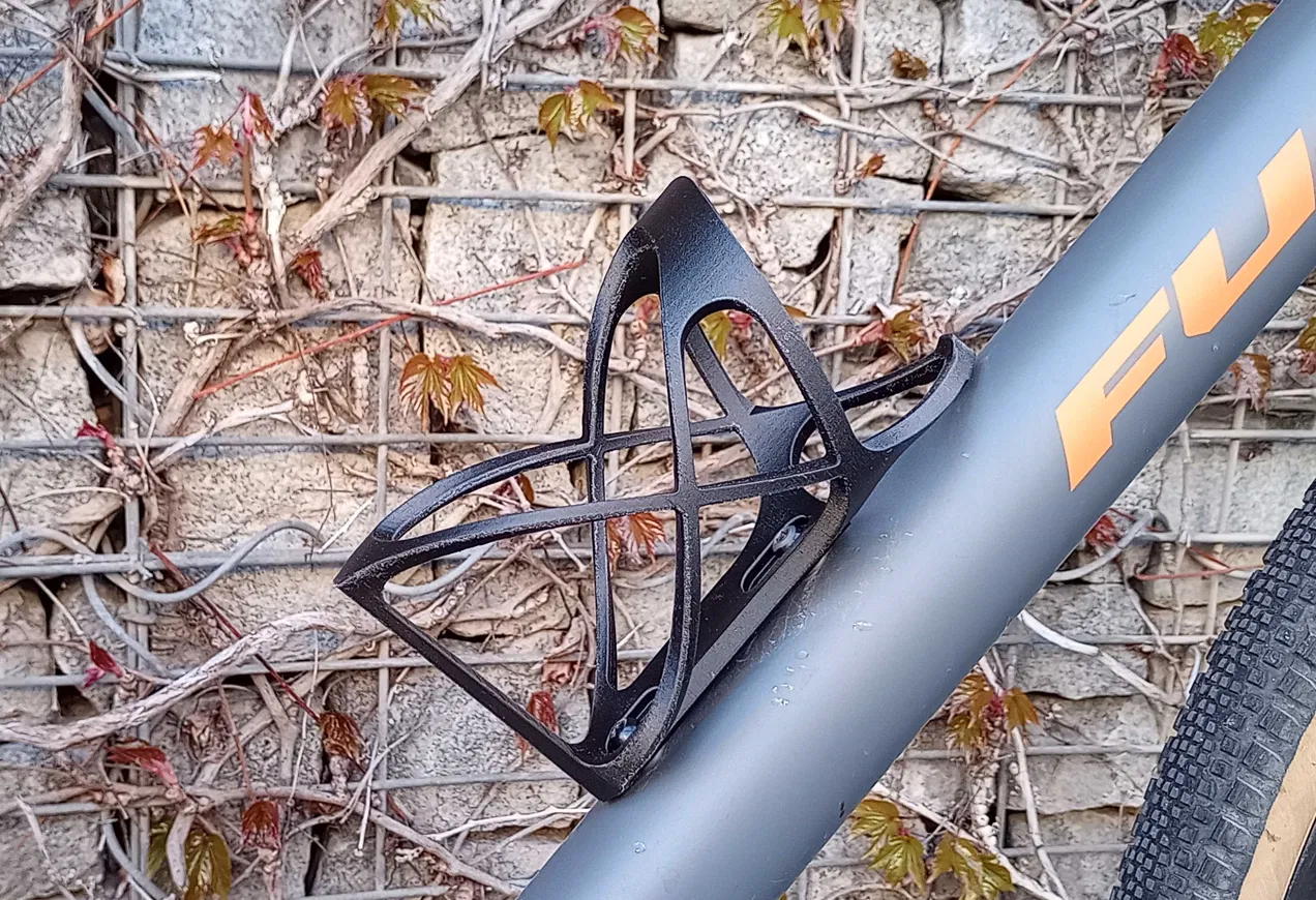Giá giữ bình nước xe đạp Bidon đã được dùng thực tế gần 2 năm, vừa bình đường kính 77 mm. Khoảng cách bu-lông 43–68 mm. Khuyến nghị in PETg (tốt nhất PETg carbon fiber), dùng supports và brim để giảm warp.