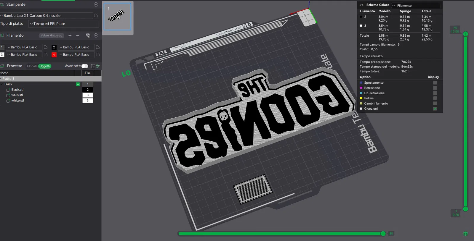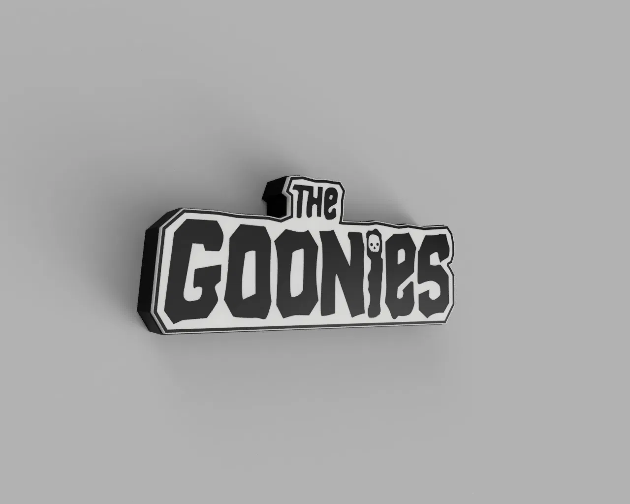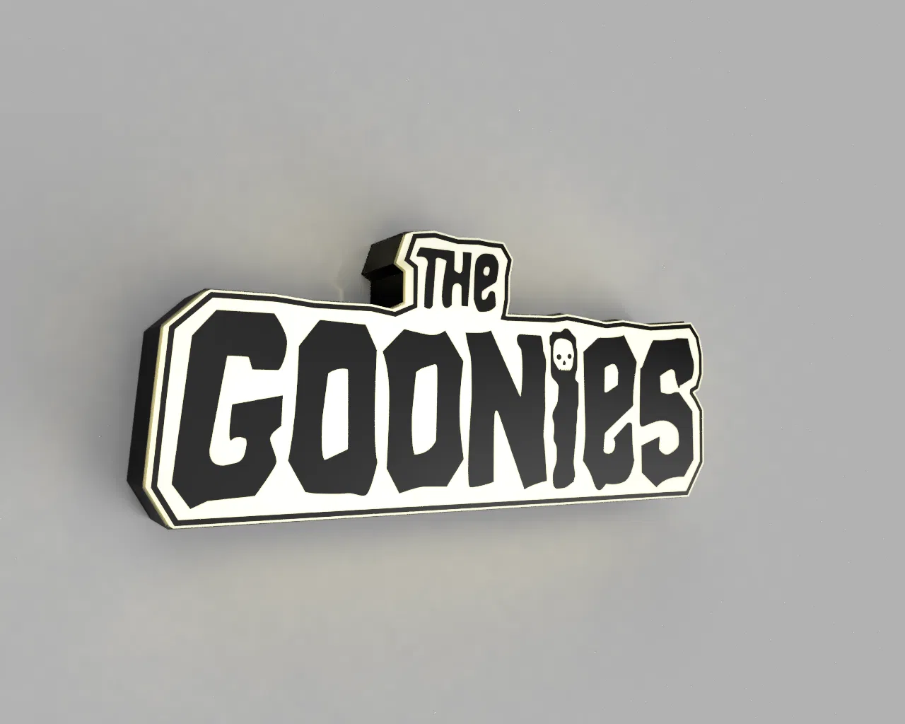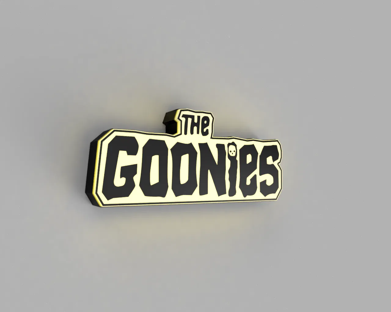 Mẫu lightbox logo phim The Goonies. File STL được chia theo từng màu để dễ gán trong Bambulab/Orca (single object, multiple parts). Backbox có lỗ 4.5mm đi dây; dán ledstrip vào là dùng được.