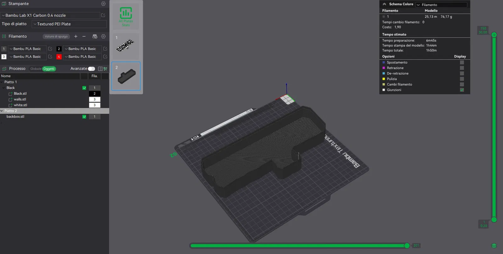 - Import vào Bambulab/Orca dưới dạng single object với multiple parts.