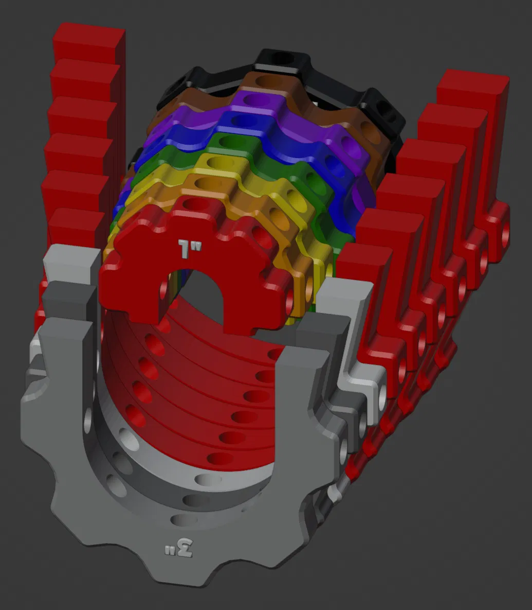 Tube Center Markers V2 nay có thêm nhiều lỗ và 17 kích thước từ 1" đến 5" (bước 1/4"). Gắn sharpie vào lỗ để kẻ 5 đường theo góc 45° hoặc 90° quanh ống, hỗ trợ khoan lỗ ngang chính xác.