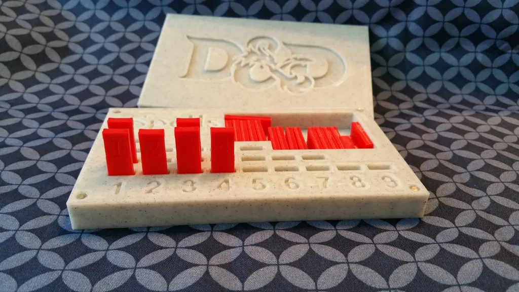 Spell Tracker cho Dungeons and Dragons giúp quản lý spell theo từng spell level bằng token. Cast xong thì gỡ token và cất lại, nghỉ (rest) thì đặt lại như cũ. Nắp dùng nam châm 3mm x 1mm; in 0.2mm, infill 10%.