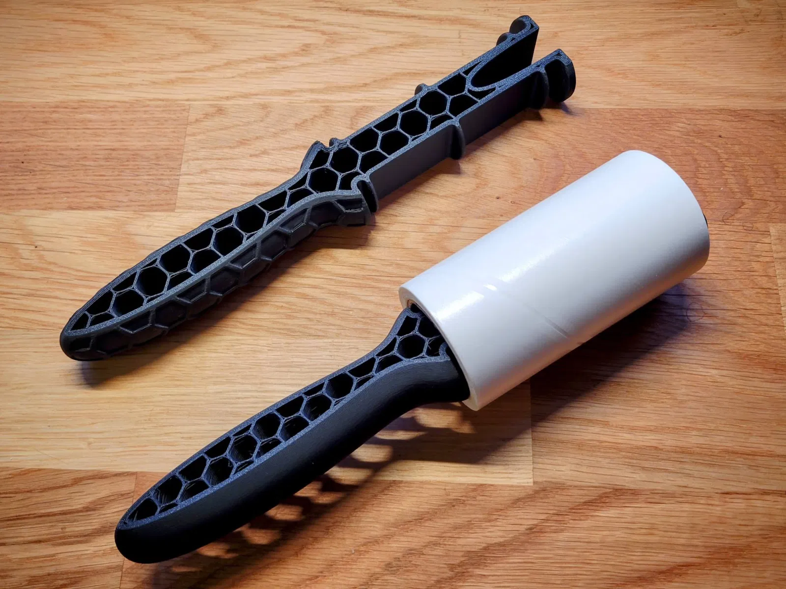 Tay cầm cây lăn bụi cứng cáp, bản lớn. Thiết kế in nằm phẳng với 0 top/bottom layers để in nhanh mà vẫn bền. Vừa refill dài 100mm (khe 38mm), phần đầu chẻ đôi dễ lắp tháo và có mặt phẳng để dựng đứng.