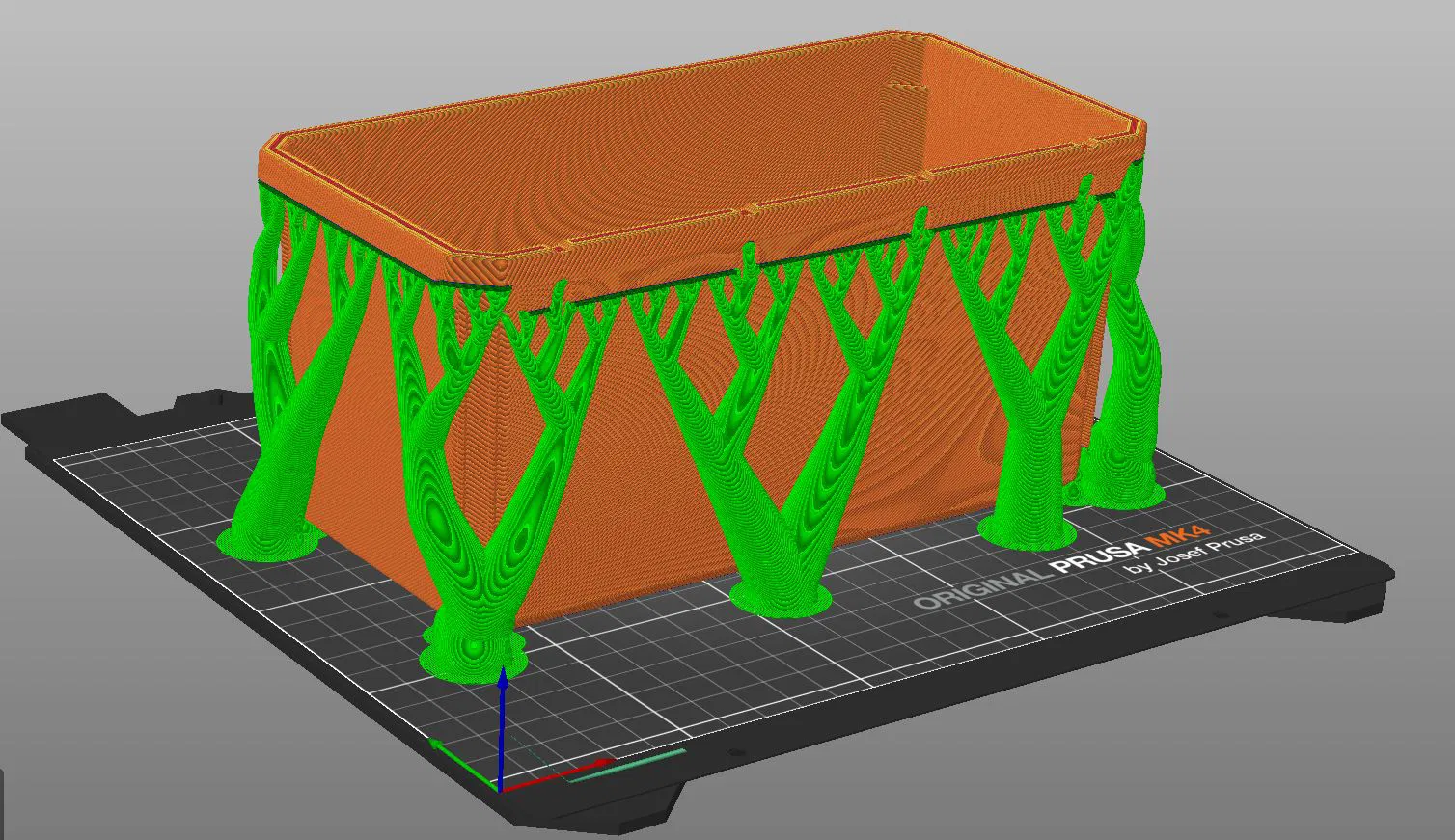 Vì vậy, đây là một khay chữ nhật tương thích với Milwaukee Packout Organizer, về chức năng thì tương đương với khay zin. Mình đã in thử bằng PLA và PETG. PLA cứng hơn và dễ gỡ organic supports hơn — chỉ cần búng là rớt ra. PETG thì mềm/dẻo hơn chút, mình nghĩ sẽ chịu rơi tốt hơn, nhưng organic supports hay bám hơn, mình phải dùng cây móc nha khoa để moi ra khỏi phần dưới cái gờ (lip). Dù vậy theo mình thì in PETG vẫn đáng.