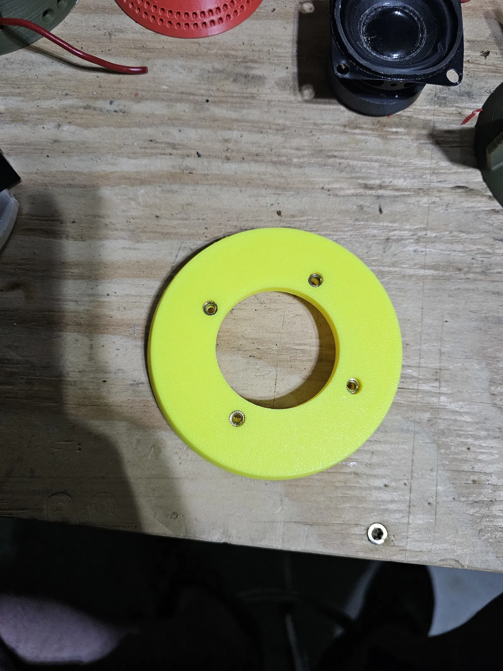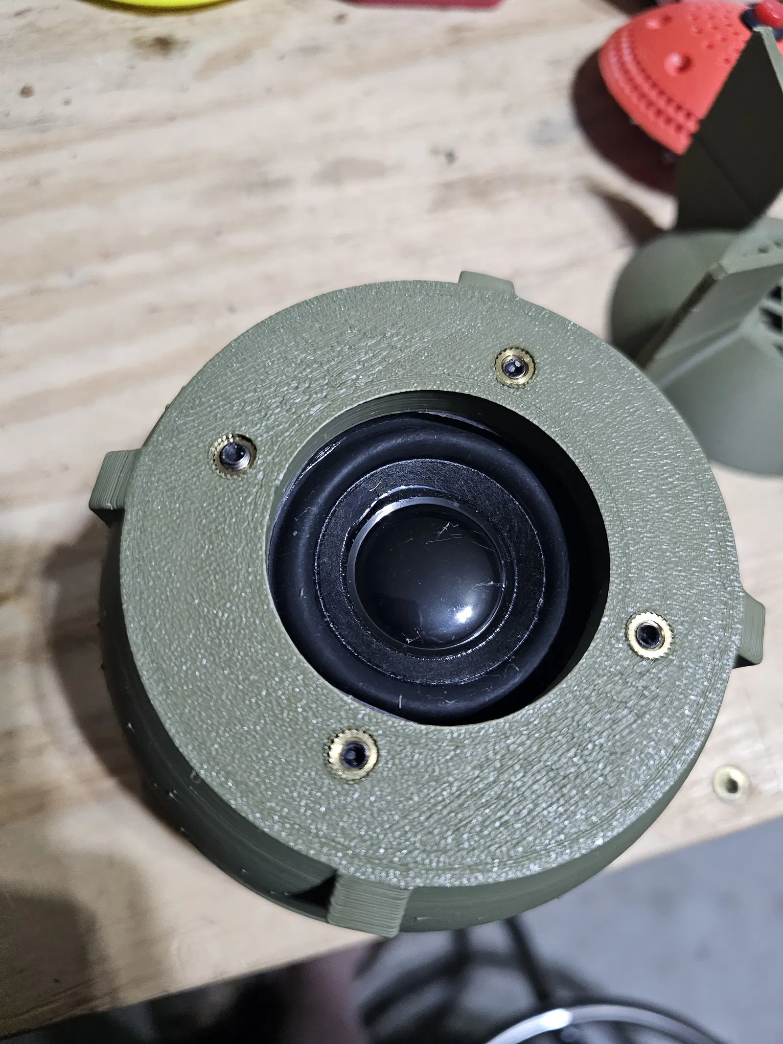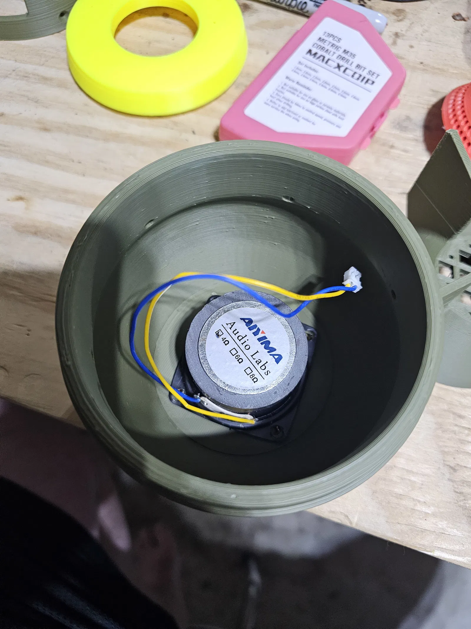 - Đặt loa dưới vào thân và đánh dấu lỗ. Khoan theo kích thước anh em muốn. Mình dùng M4x8 cho dự án này. Nếu muốn thì lắp heatsets rồi bắt chặt loa. Làm tương tự với nắp vàng như hình.
