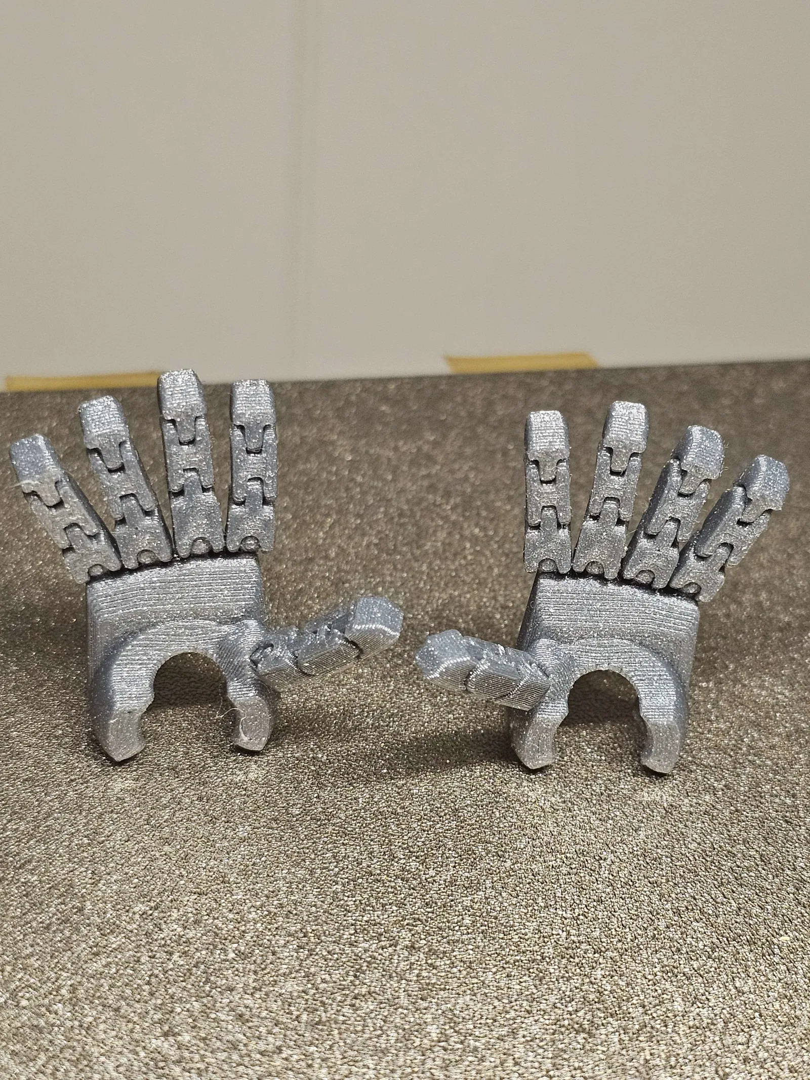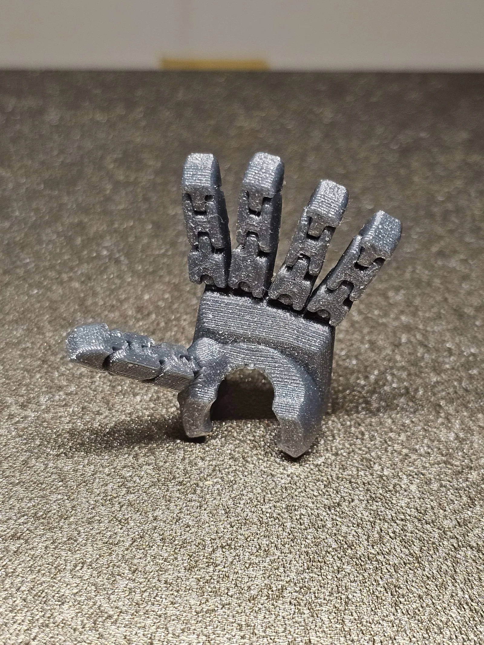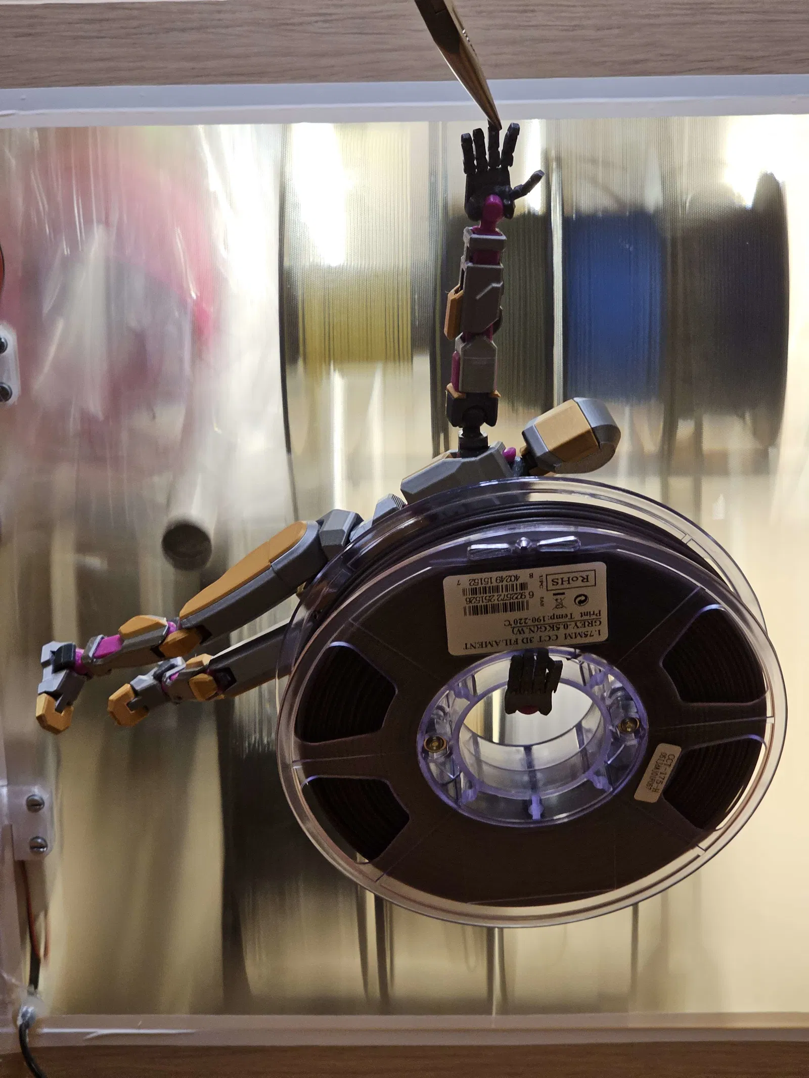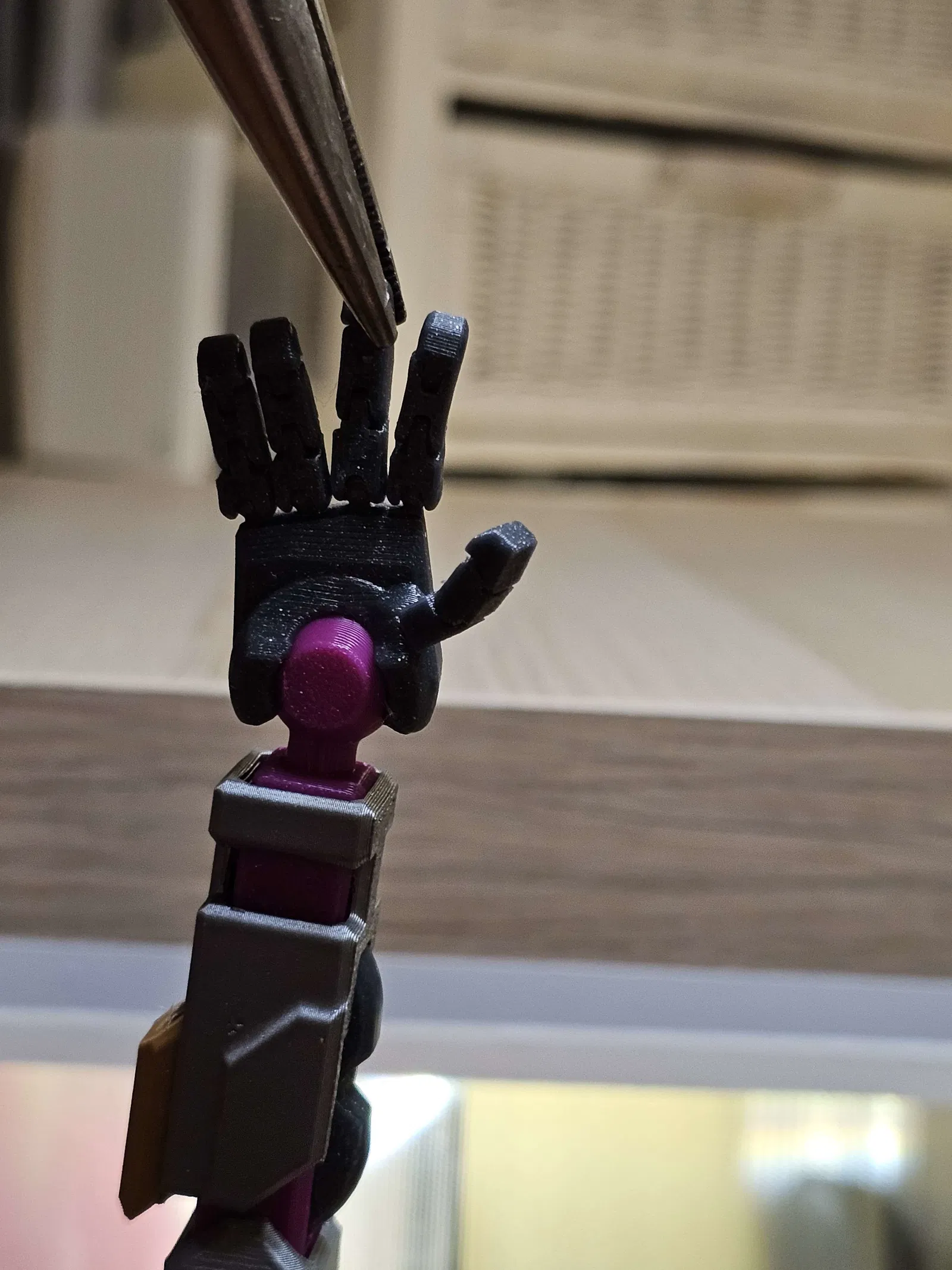 Trong một tấm hình, mình kẹp một đầu ngón bằng kìm rồi treo thêm cuộn filament 0.5kg làm tạ—thậm chí còn có thể treo nặng hơn nữa! Mình mất nhiều tháng redesign, in đi in lại để tăng độ bền, giữ ma sát, và vẫn đảm bảo biên độ chuyển động tốt.