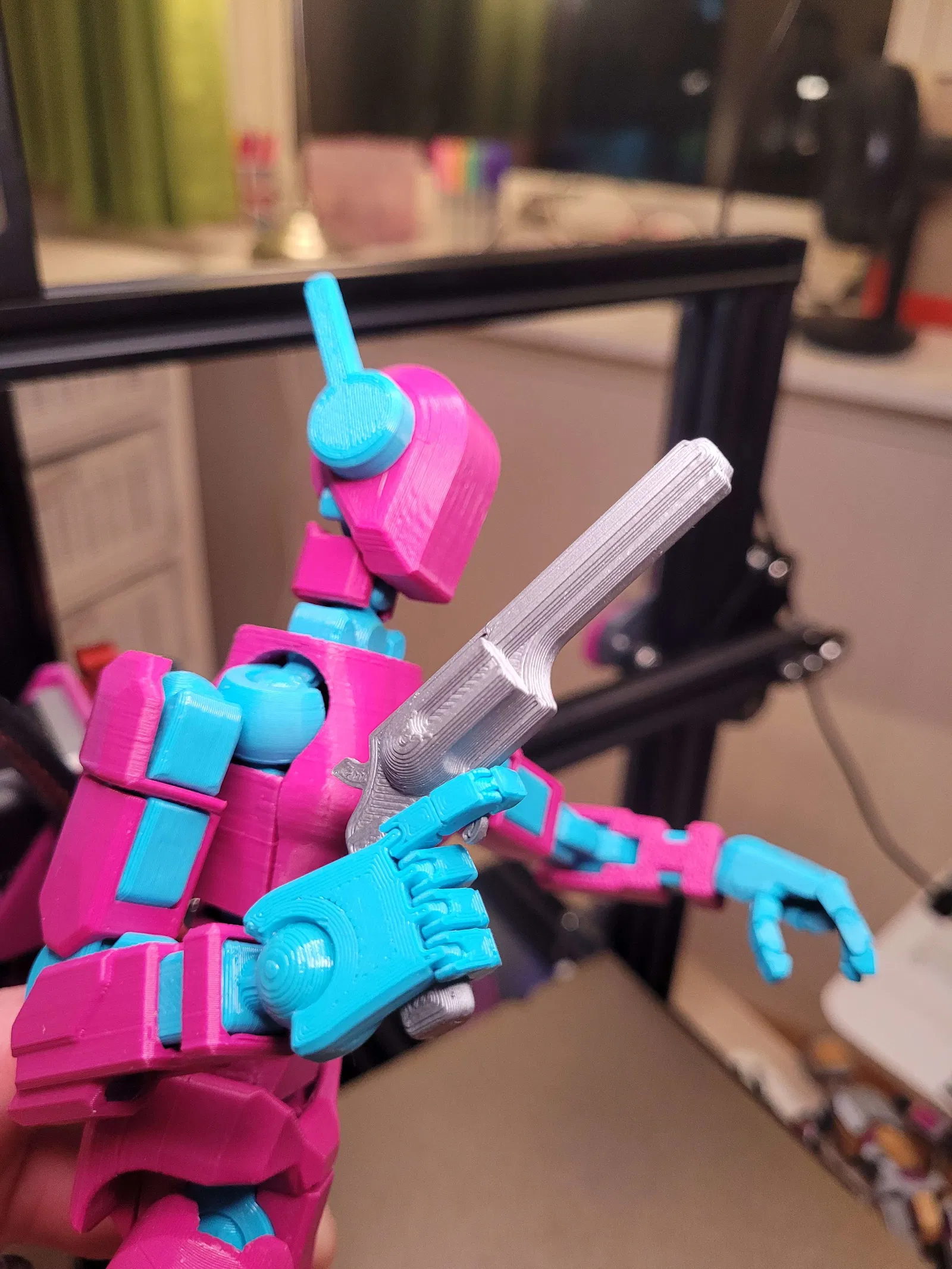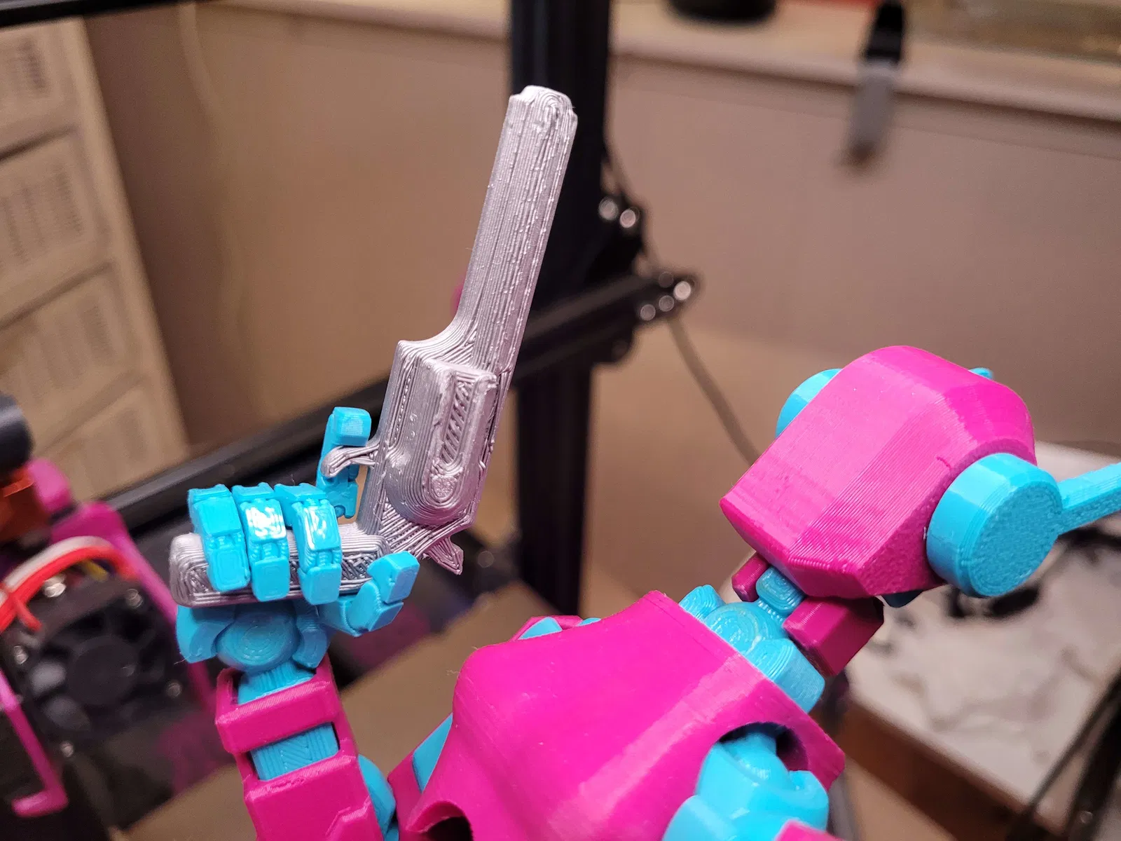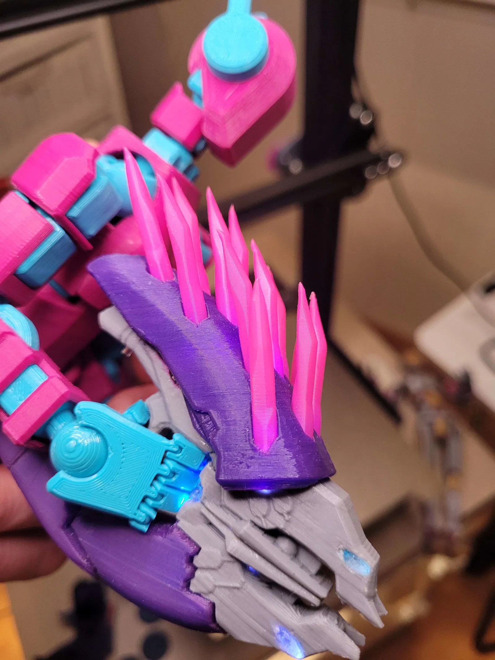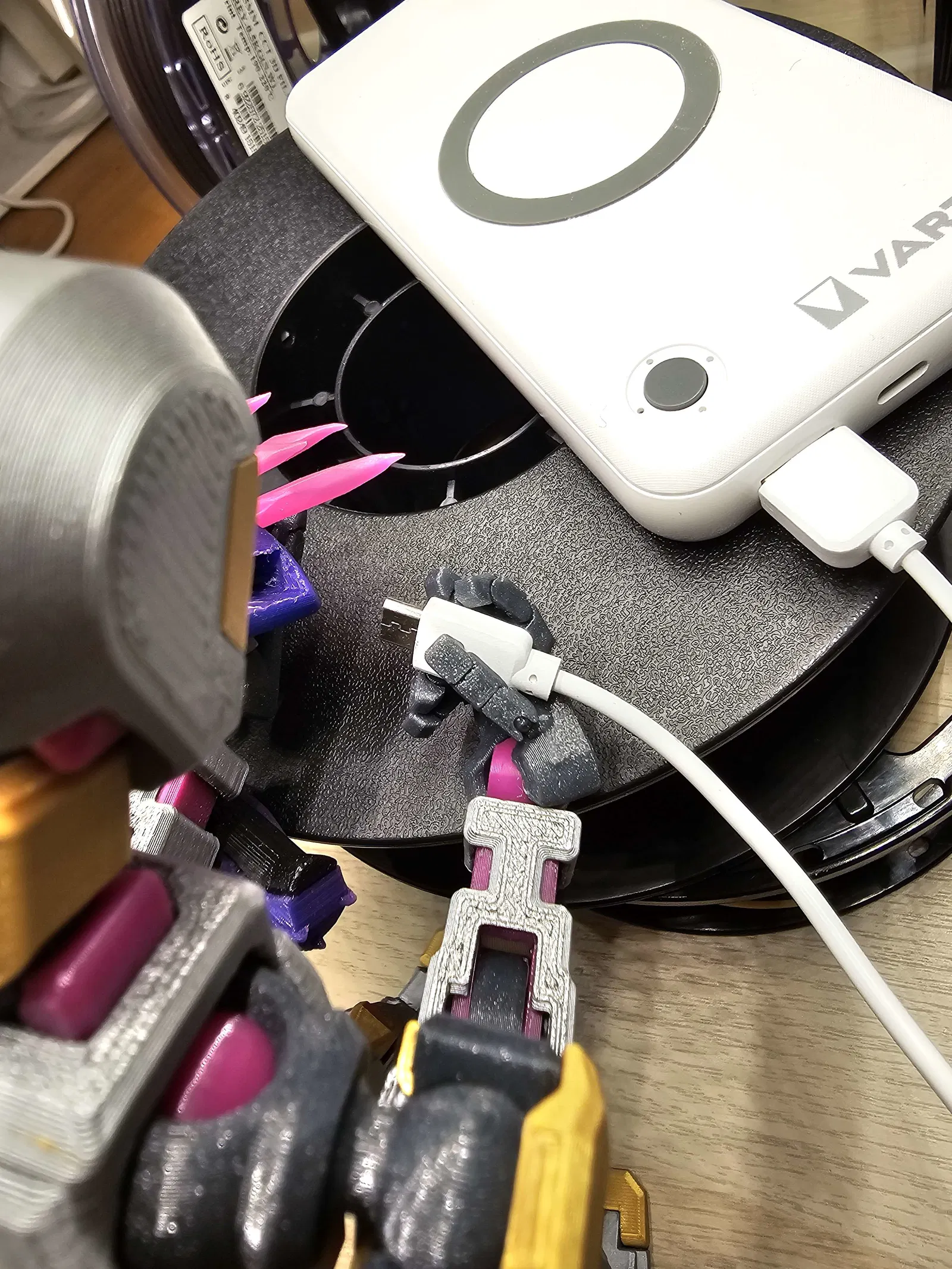 Trong một tấm hình, mình kẹp một đầu ngón bằng kìm rồi treo thêm cuộn filament 0.5kg làm tạ—thậm chí còn có thể treo nặng hơn nữa! Mình mất nhiều tháng redesign, in đi in lại để tăng độ bền, giữ ma sát, và vẫn đảm bảo biên độ chuyển động tốt.