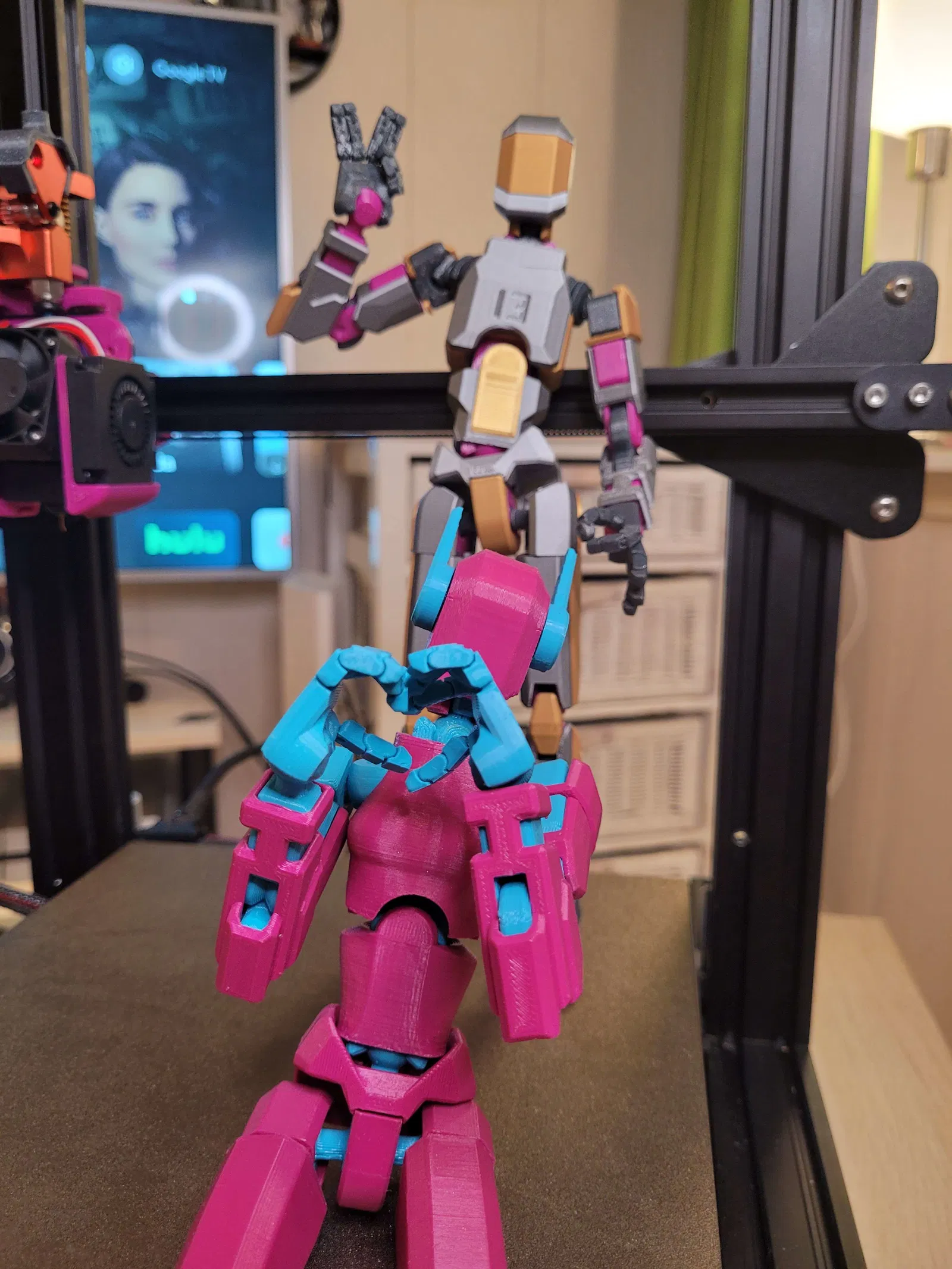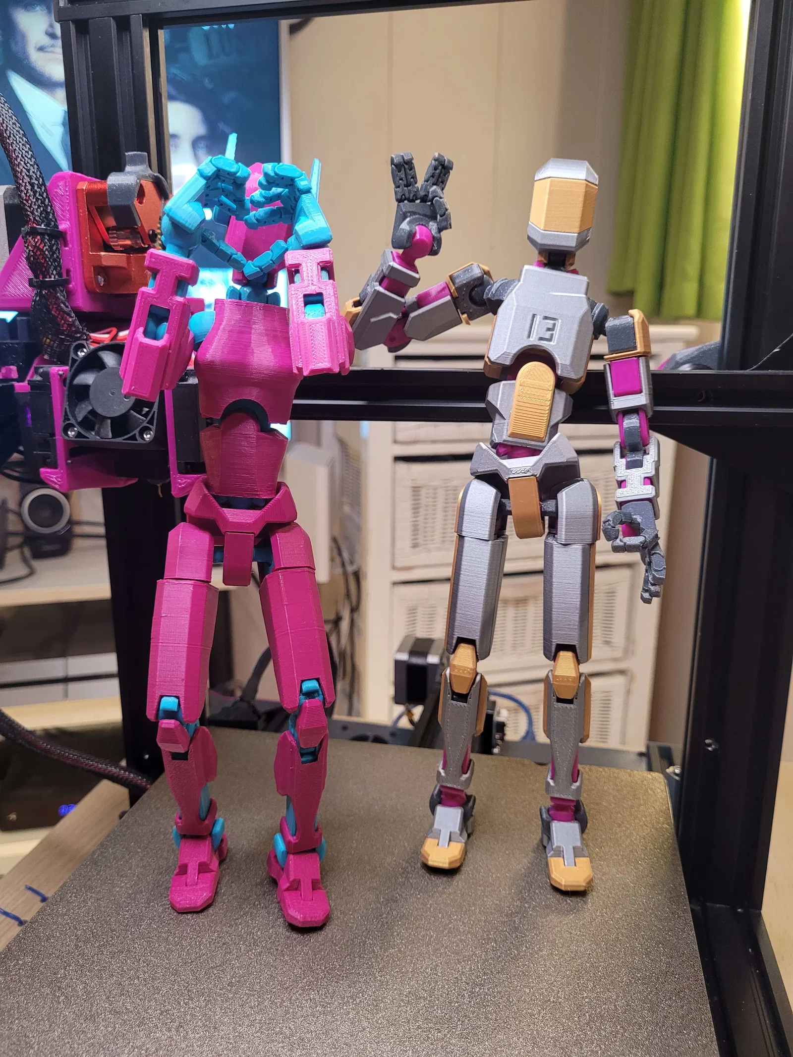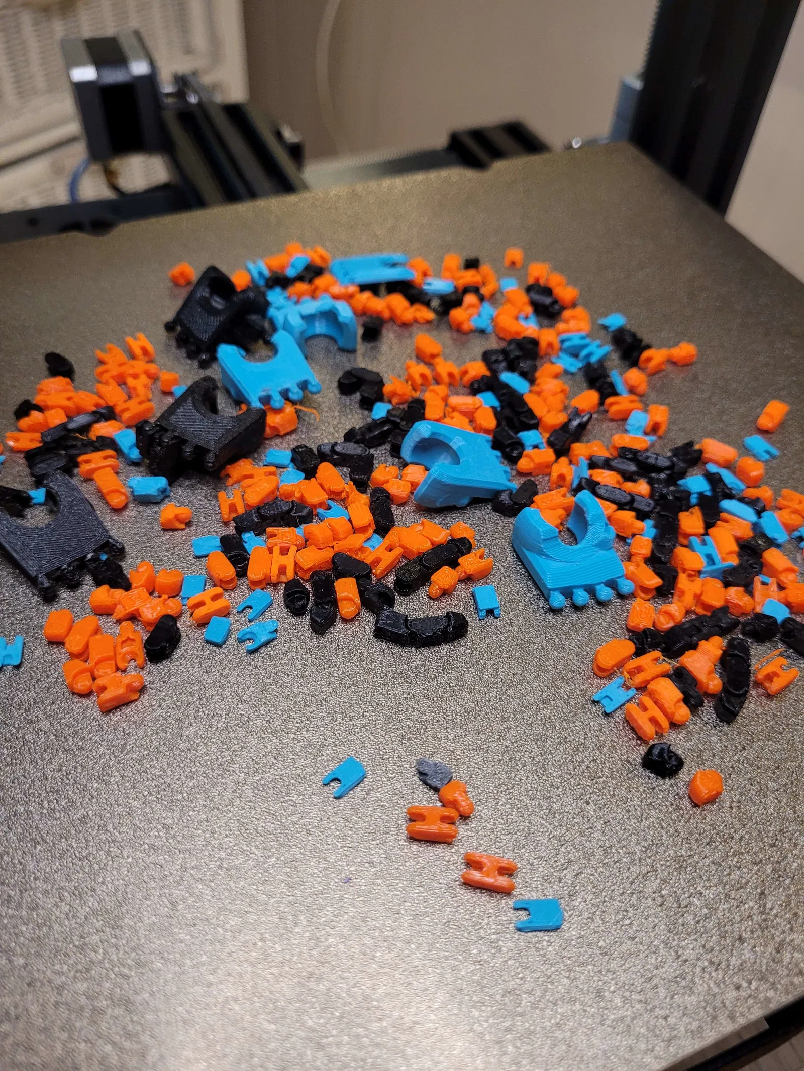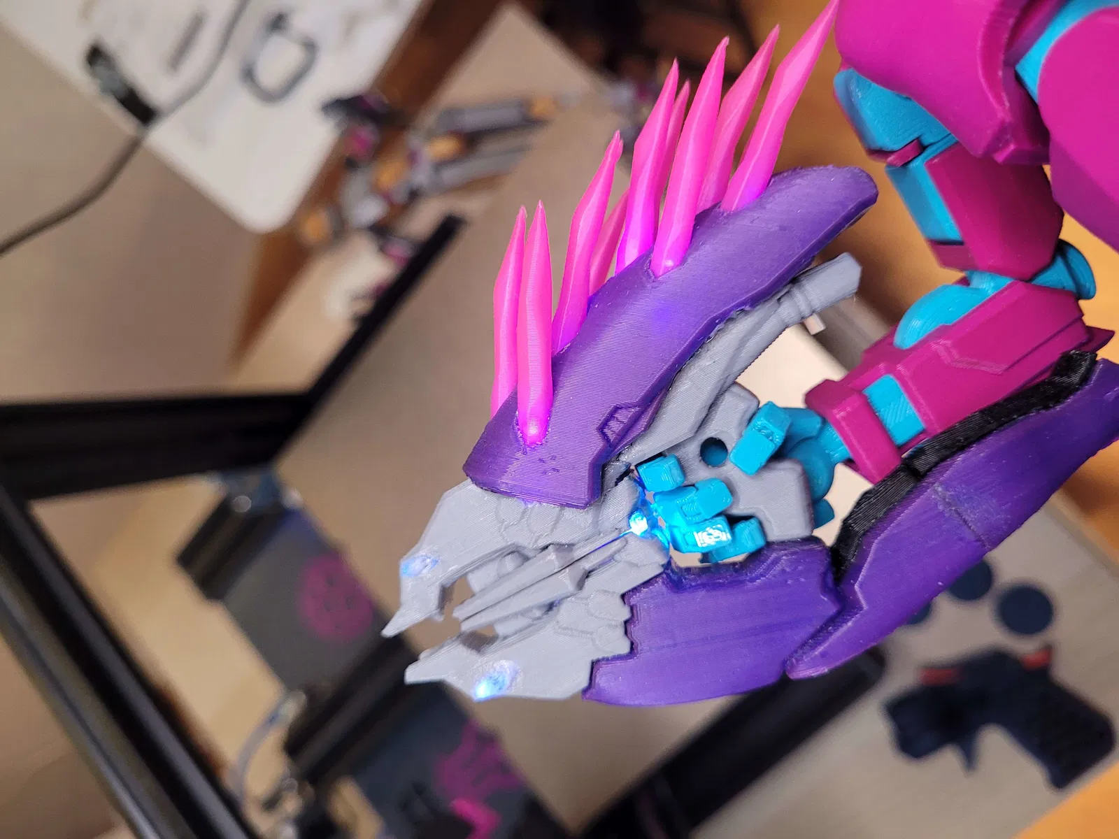 Trong một tấm hình, mình kẹp một đầu ngón bằng kìm rồi treo thêm cuộn filament 0.5kg làm tạ—thậm chí còn có thể treo nặng hơn nữa! Mình mất nhiều tháng redesign, in đi in lại để tăng độ bền, giữ ma sát, và vẫn đảm bảo biên độ chuyển động tốt.