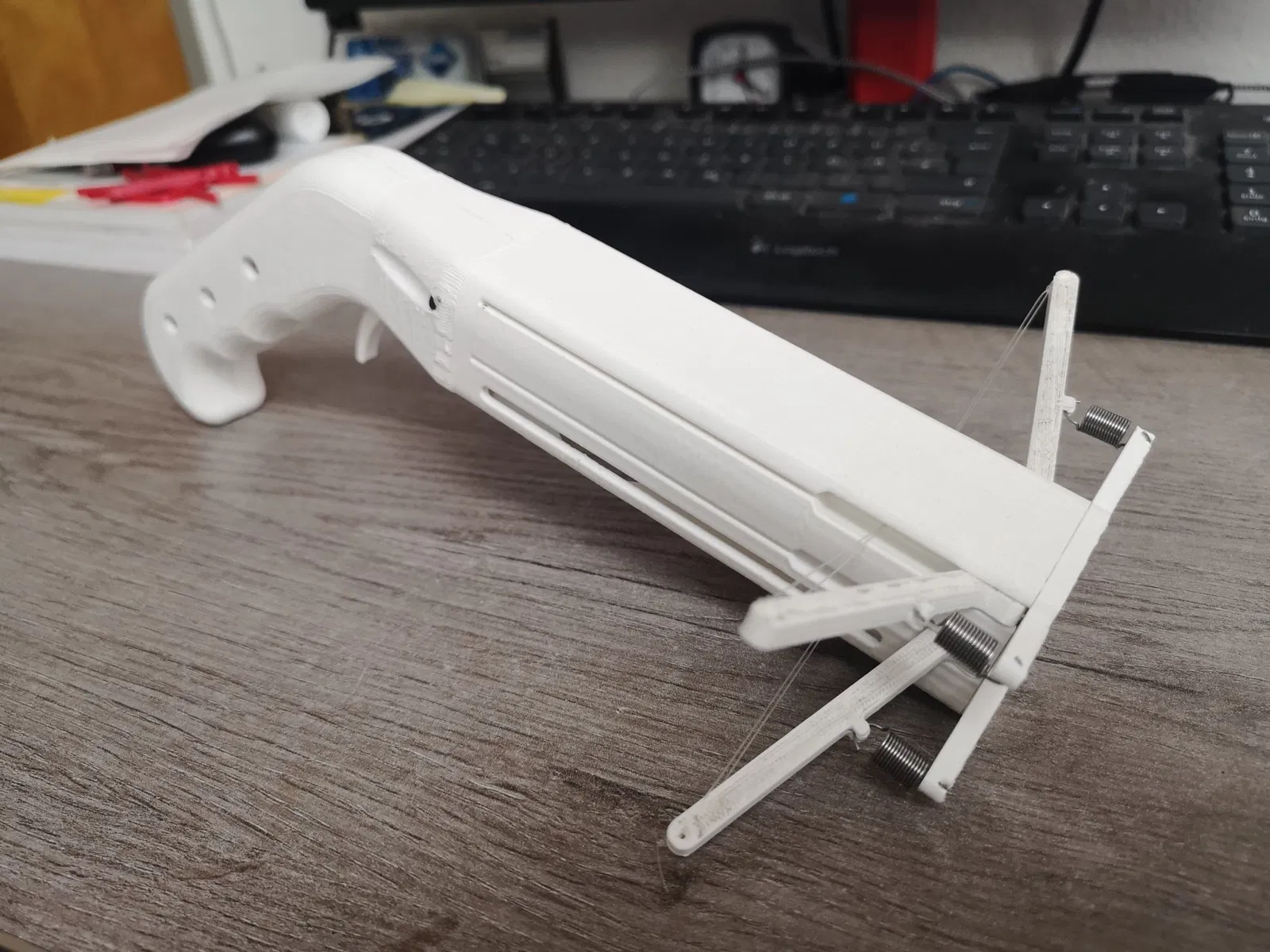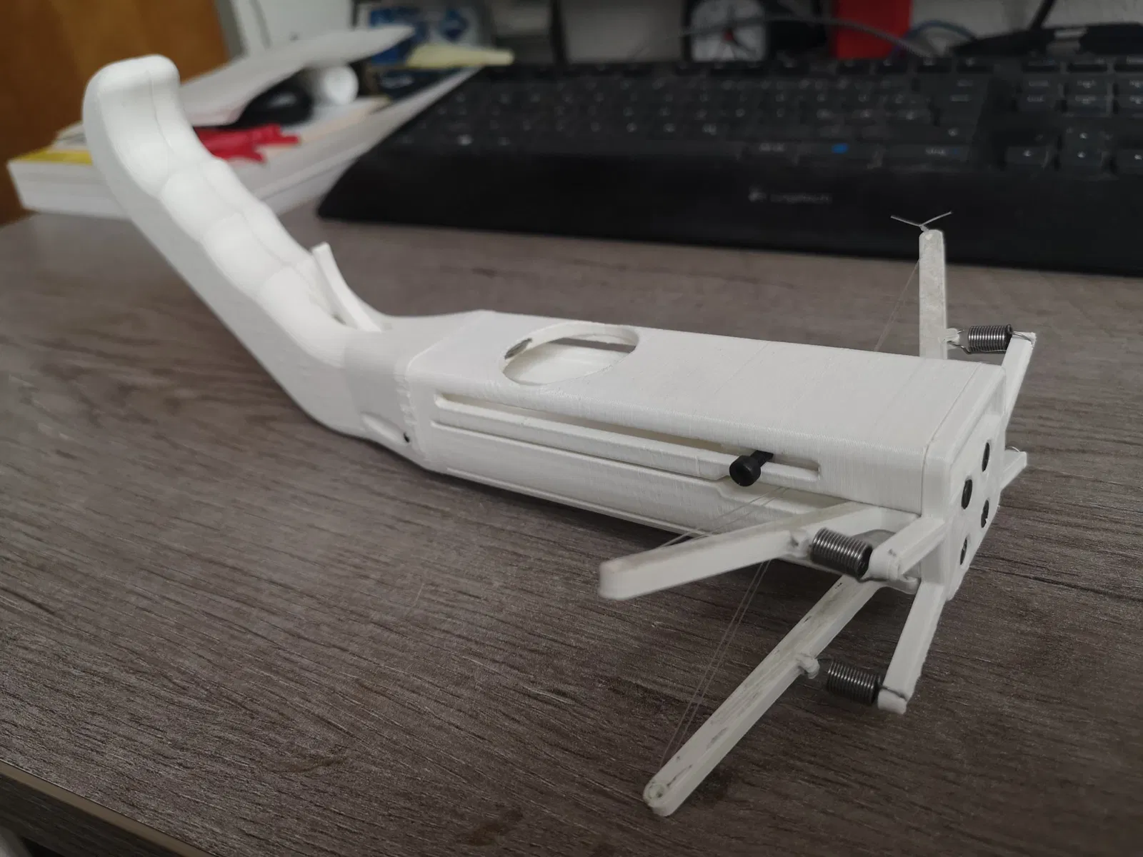 Cảm ơn lớn đến ss3dprintingBE vì đã truyền cảm hứng. Máy in: FDM Vật liệu: PLA Chiều cao lớp: 0,3 Tỷ lệ lấp đầy: 10% Tường: 3 Hỗ trợ: chỉ cần thiết cho tay cầm và bộ tăng tốc Các bộ phận tiêu chuẩn: DIN EN ISO 4762 - M3x15 → Tay cầm 5x DIN EN ISO 7046 - M3x5 → Mặt trước 4x DIN EN ISO 8734 - 3x8 → Cánh tay ném 4x DIN EN ISO 8734 - 3x12 → Cò 1x DIN EN ISO 10270 - 0,55x6,0x13,9 → Cánh tay ném 4x DIN EN ISO 9012 M5 → Thân chính 1x Tôi đã sử dụng một loại dây câu cá Ø0,3mm. Bạn có thể vặn các bu lông trực tiếp vào nhựa, nhưng tôi khuyên bạn nên cắt nó trước bằng một cái tab. Để giảm ma sát, hãy đánh bóng bộ tăng tốc một chút và sử dụng một ít mỡ. Các mảnh nhỏ trên thân chính chỉ để hỗ trợ trong khi in, những cái này có thể được cắt bỏ.