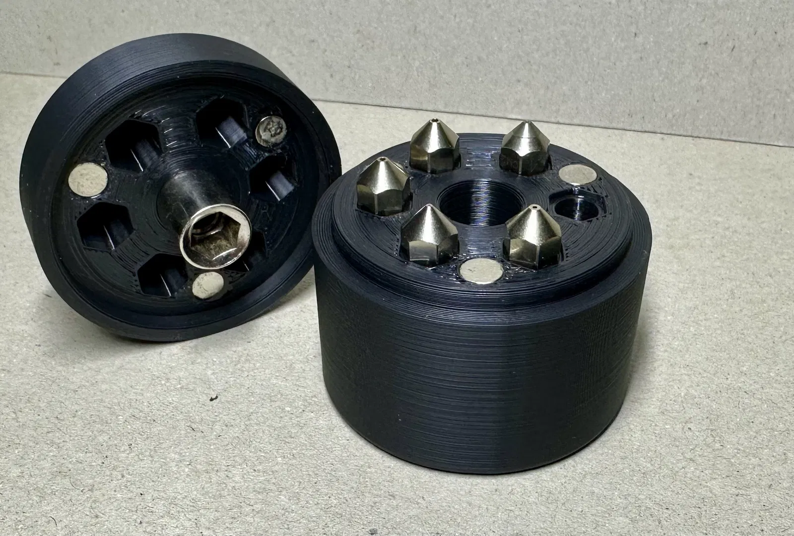 Hộp đựng 6 nozzle Micro Swiss FlowTech, nắp giữ bằng 3 nam châm 6 mm (dày 1.6 mm). Trên nắp có lỗ cất cờ lê 7 mm/đường kính 11.45 mm, lực siết khuyến nghị 1.7 Nm.