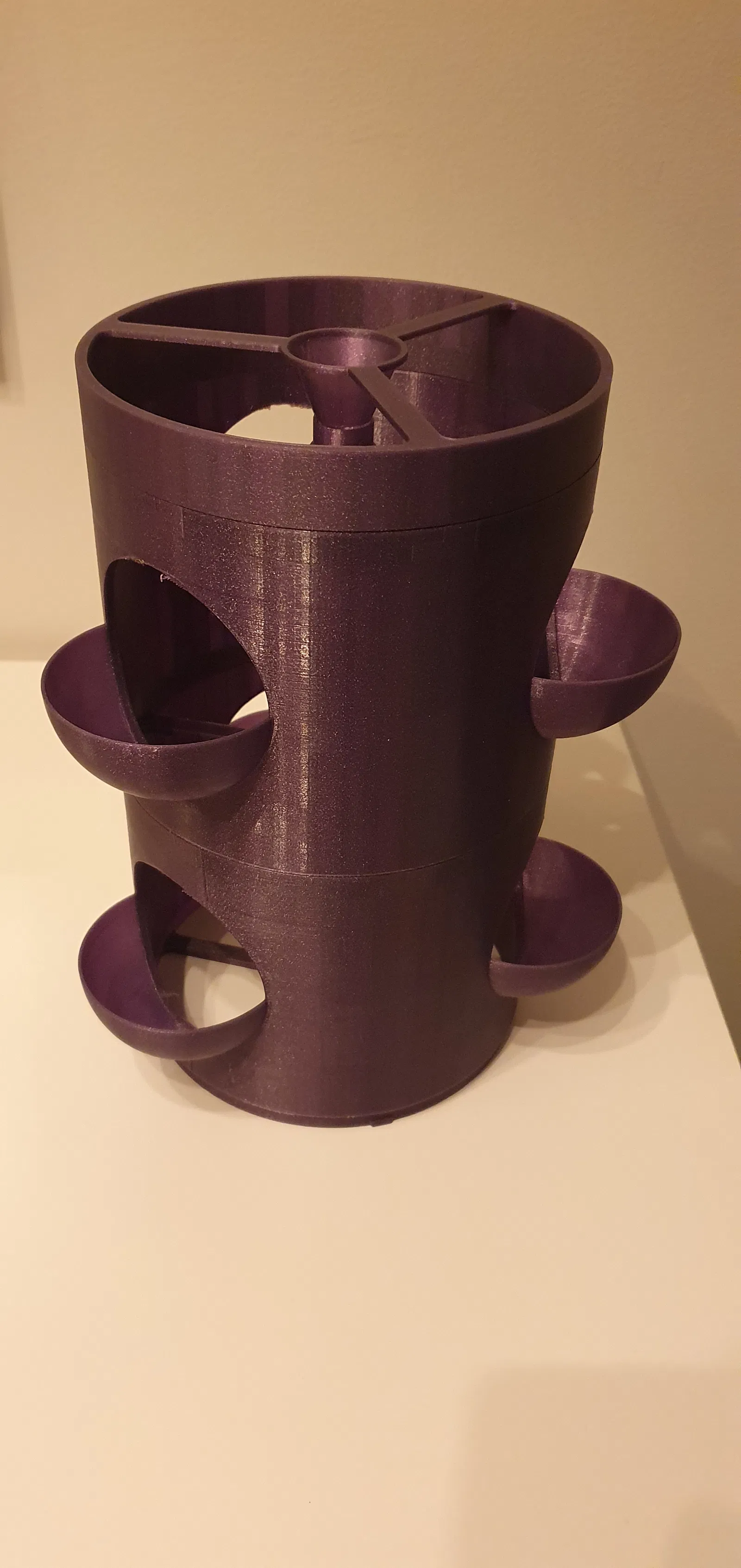 Chậu trồng dâu tây dạng mô-đun (modular) có các hộc/scoop để đặt cây vào. Thiết kế có cột trung tâm tích hợp để tưới nước thông qua phễu (funnel). Cơ chế khóa có 2 vị trí — canh thẳng hàng hoặc xen kẽ các scoop, xem hình minh họa.