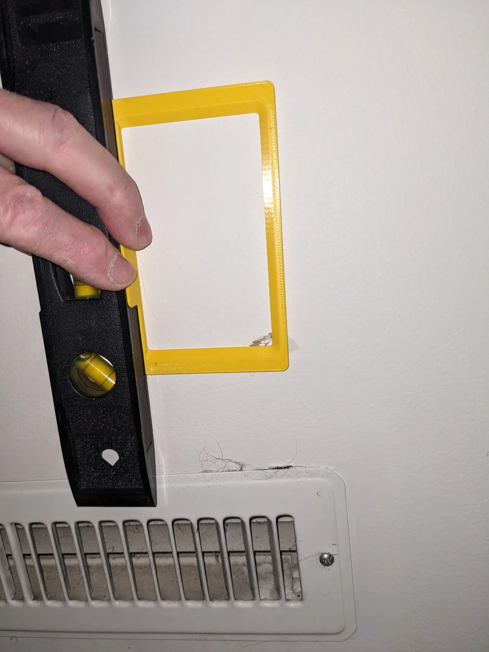 - Đặt template vào vị trí mong muốn cho bracket, đồng thời áp thước thủy (bubble level) vào cạnh vuông góc (xem ảnh).