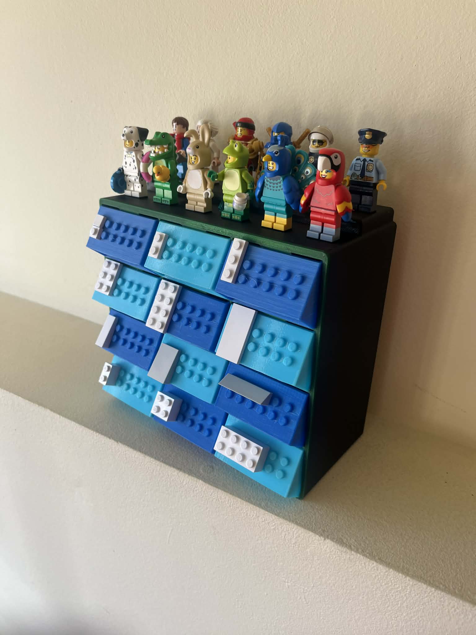Hộp này dùng để phân loại các khối xếp hình, với các núm được thiết kế trên ngăn kéo giúp bạn đánh dấu khối xếp hình một cách tiện lợi. Để gắn các hình lên kệ, bạn chỉ cần ấn nhẹ khối xếp hình vào, không cần dùng keo vì nó đã vừa khít.