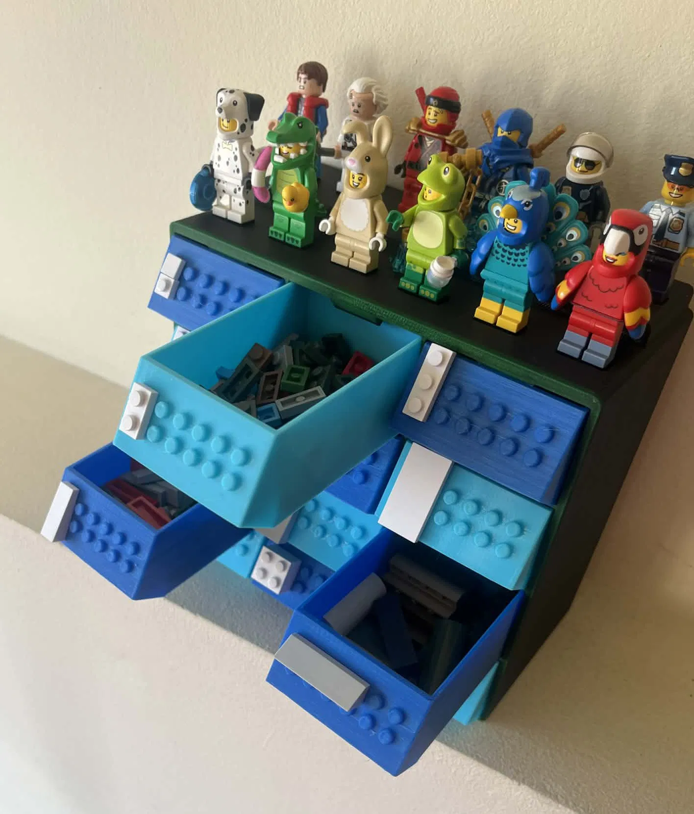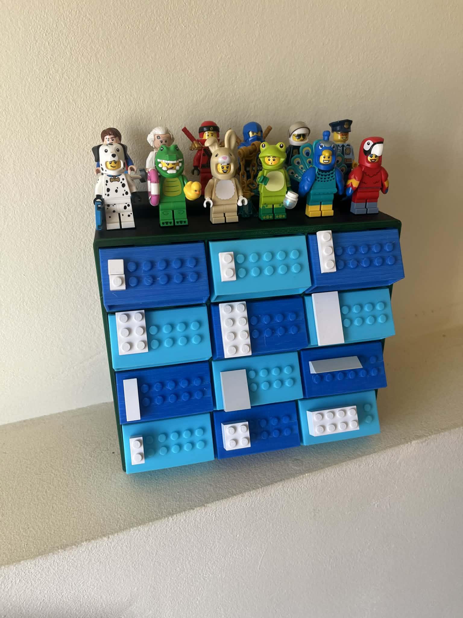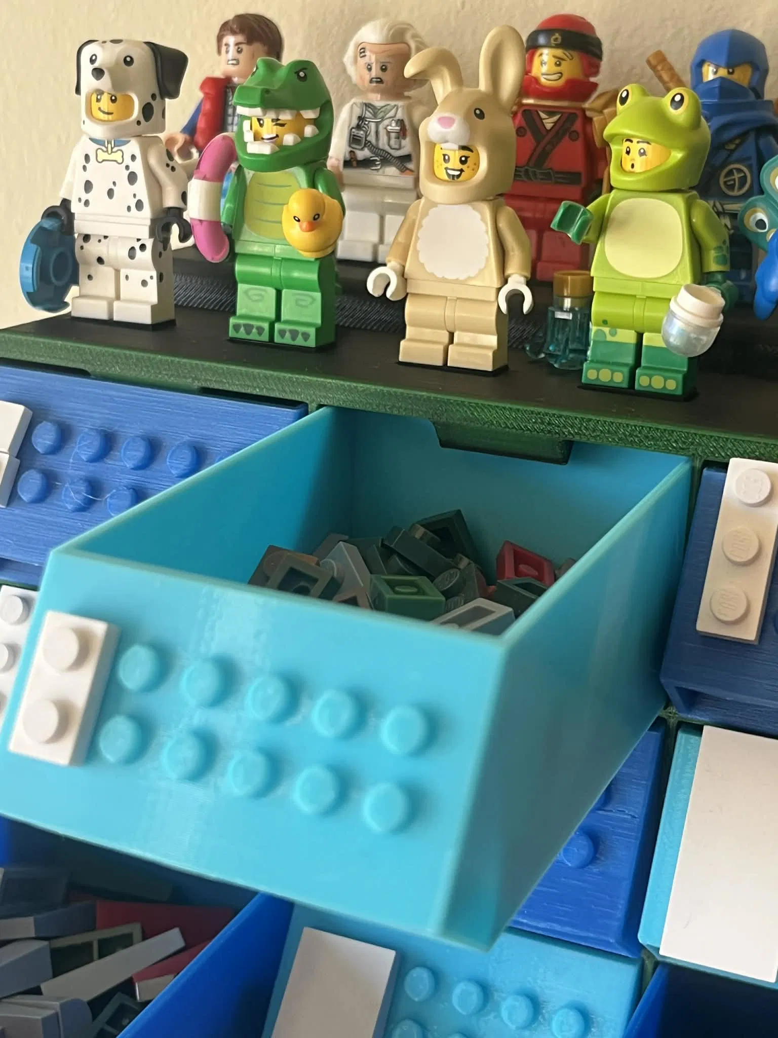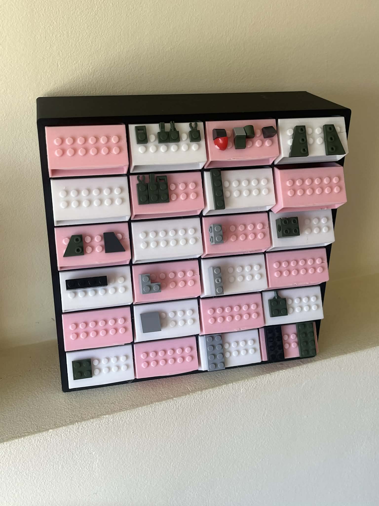Cái hộp để phân loại khối xếp hình, có các núm ở ngăn kéo để đánh dấu khối xếp hình dễ dàng hơn.