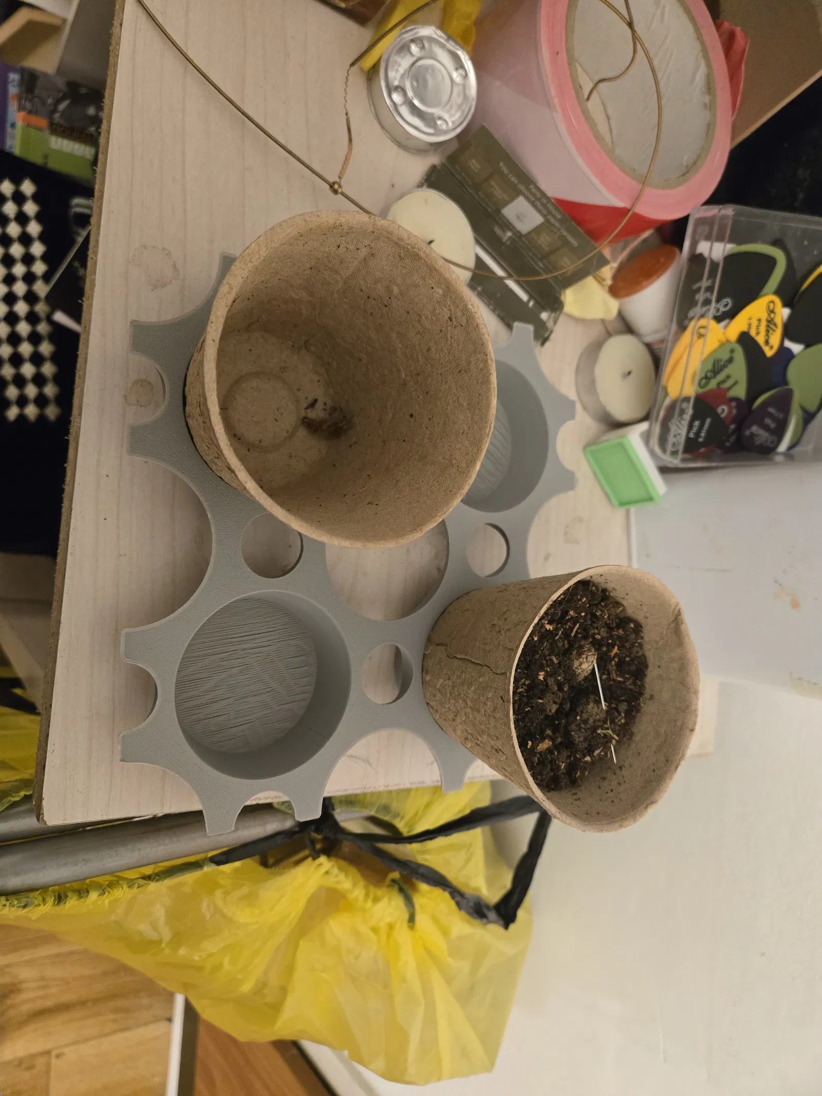 Cái đế này dùng để giữ nhiều chậu giấy Fiberpotter. Có hai loại: đế dưới và đế giữa, cho chậu có đường kính đáy 5cm và miệng 8cm. Bạn có thể tùy chỉnh số lượng chậu theo ý muốn qua OnShape.